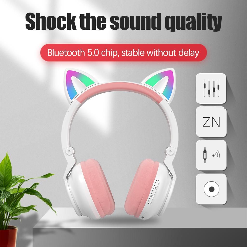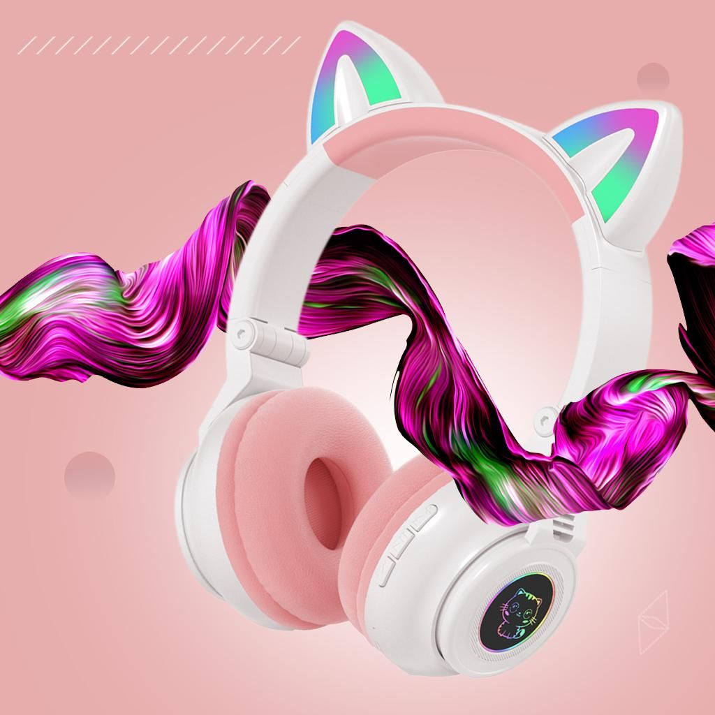Cute Cat Ear & GRB Color Changing Light: The cute wireless headphones features with a lovely cat and color changing lights. It can add fun and convenient.