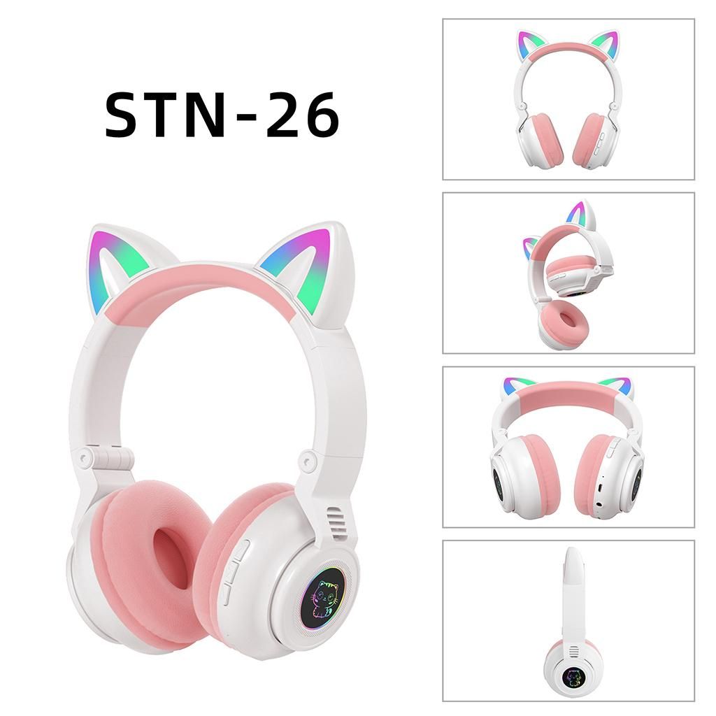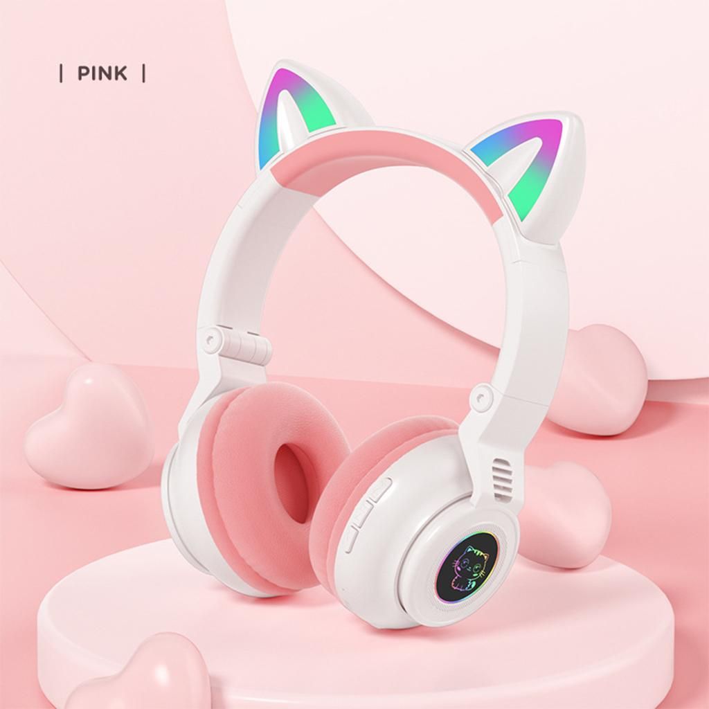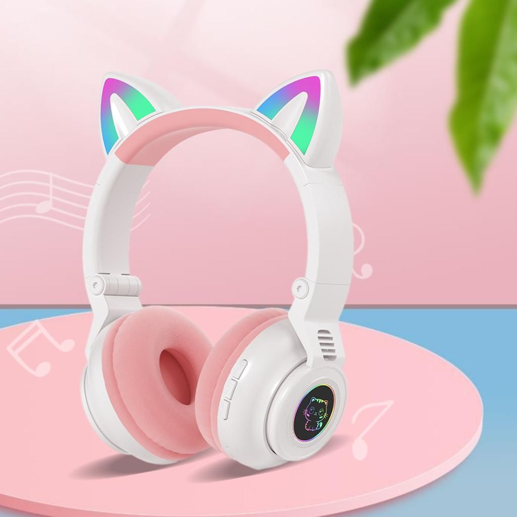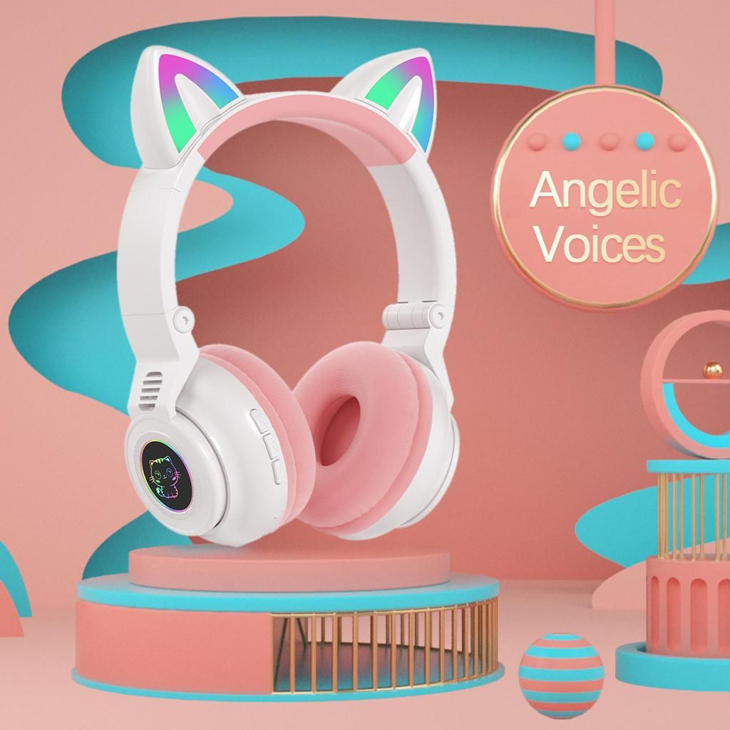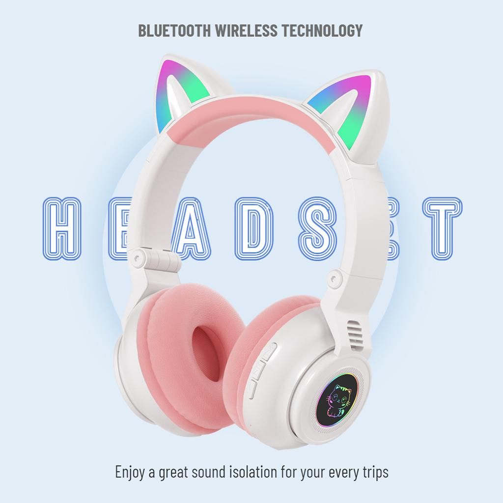 Cute Cat ; GRB Color Changing Light: The cute wireless headphones features with a lovely cat and color changing lights. It can and convenient.