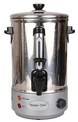 - Temperature Control System.Master Chef Electric Kettle 15litres is the ideal solution for serving a large number of hot drinks at one time, it's great to use at home when you're throwing a garden party or BBQ; at the Office for tea breaks; or at commercial events such as School Fairs and Village or Church Hall functions. The urn is very robust, with durable stainless steel construction and has a concealed heating element for easy cleaning. It has an energy saving thermostat ranging from 30 - 110 °C plus a keep warm function. It also features a non-drip tap and water level indicator so you can view how much water is remaining in the tank at any time. Safety features include a locking lid with cool to touch handles, built-in fuse protection and an automatic and manual resettable thermostat.