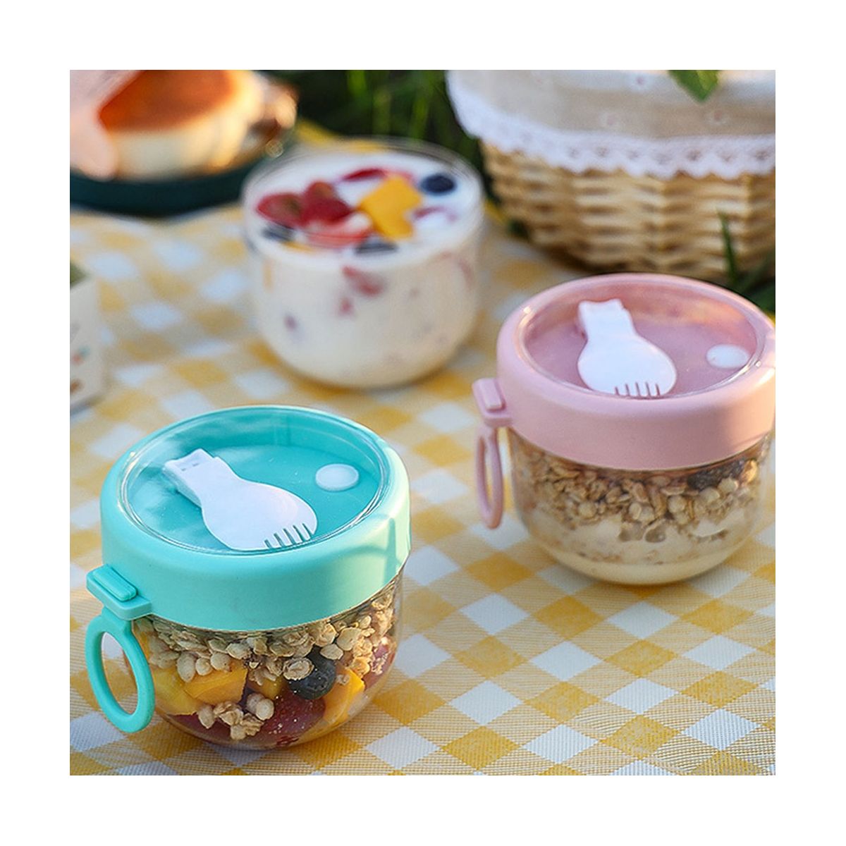 Overnight oatmeal jar with cute appearancecome with airtight lid plastice spoon and portable silicone handle which can be carried around and it's an perfect for families restaurants travel and camping Also it's a perfect gift for parties Thanksgiving Christmas or any other important holidays
