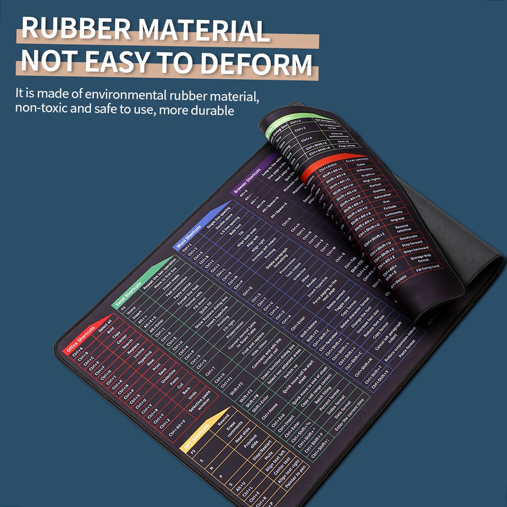Features:The large size of desk pad is an ideal choice for all office workers and learners, suitable for most desktop computers and notebooks.Shortcut keys picture of mouse pad could largely improve your work efficiency in office use, including Office, PPT, Excel, Word, Browser, PS multifunctional shortcuts. It's also suitable for gaming use.
