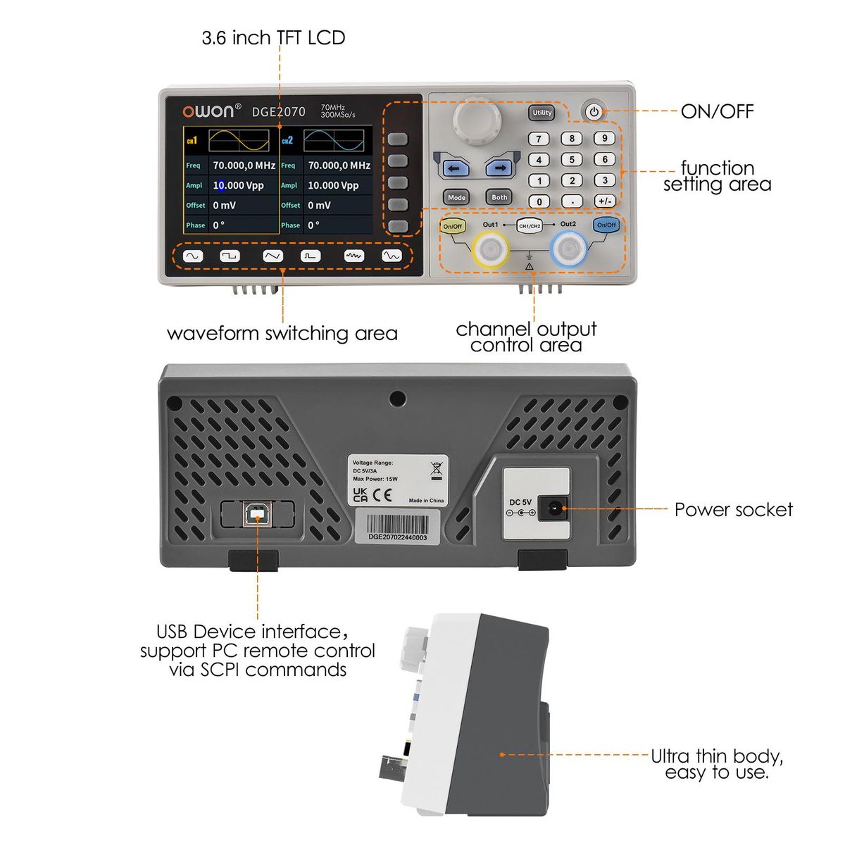 Buy Owon DGE2070 Digital Storage Oscilloscope Dual Channel Mini Portable Oscillometer Arbitrary Waveform Generator 2CH 70MHz 300MS/s 3.6-inch LCD Display in Nigeria