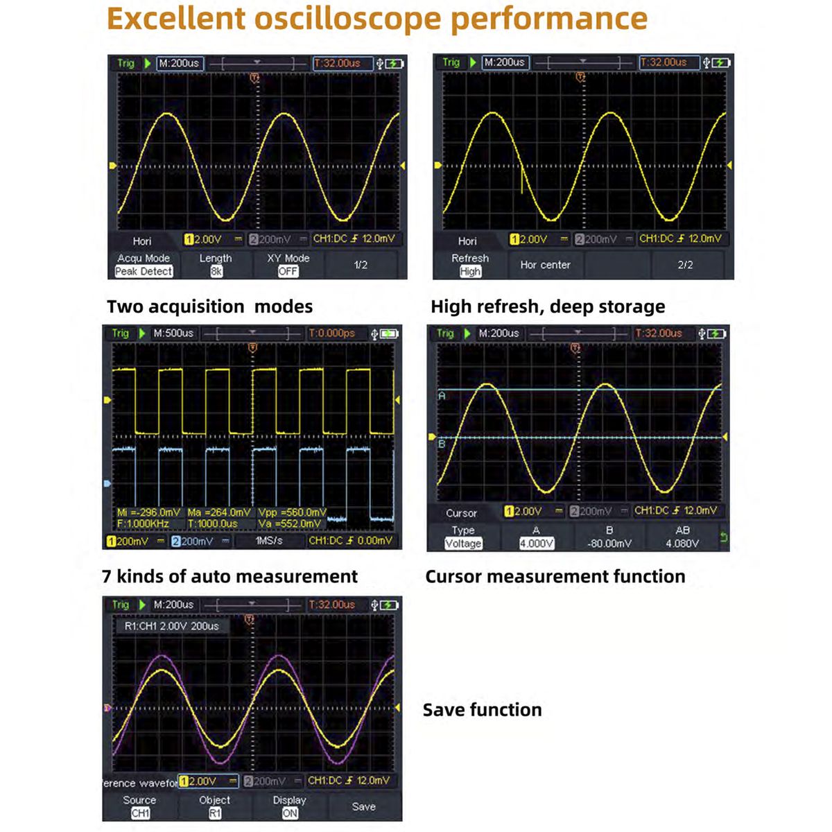 Features:[2 in 1 Oscilloscope and Multimeter] Oscilloscope -- dual channels input, 200MHz bandwidth, 1GSa/s sampling rate. Multimeter -- true RMS, 20000 counts, auto range, voltage/ current/ resistance/ diode/ capacitance/ continuity testing.