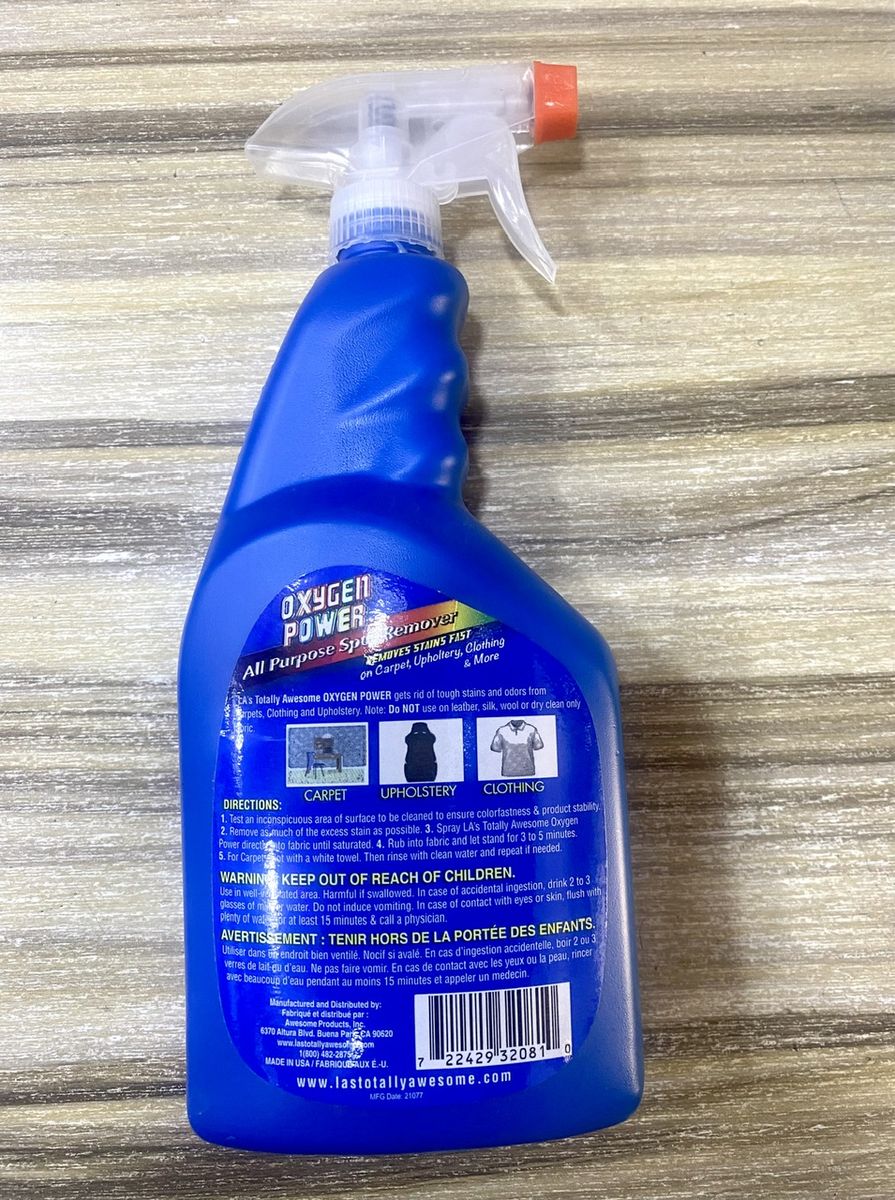 Directions:1. Test an inconspicuous area of surface to be cleaned to ensure colorfastness and product stability2. Remove as much of the excess stain as possible 3. Spray LA's Totally Awesome Oxygen Power directly onto fabric until saturated 4. Rub into fabric and let stand for 3 to 5 minutes5. For carpets clot with a white towel. Then rinse with water and repeat if needed.