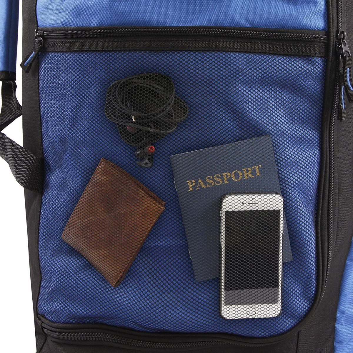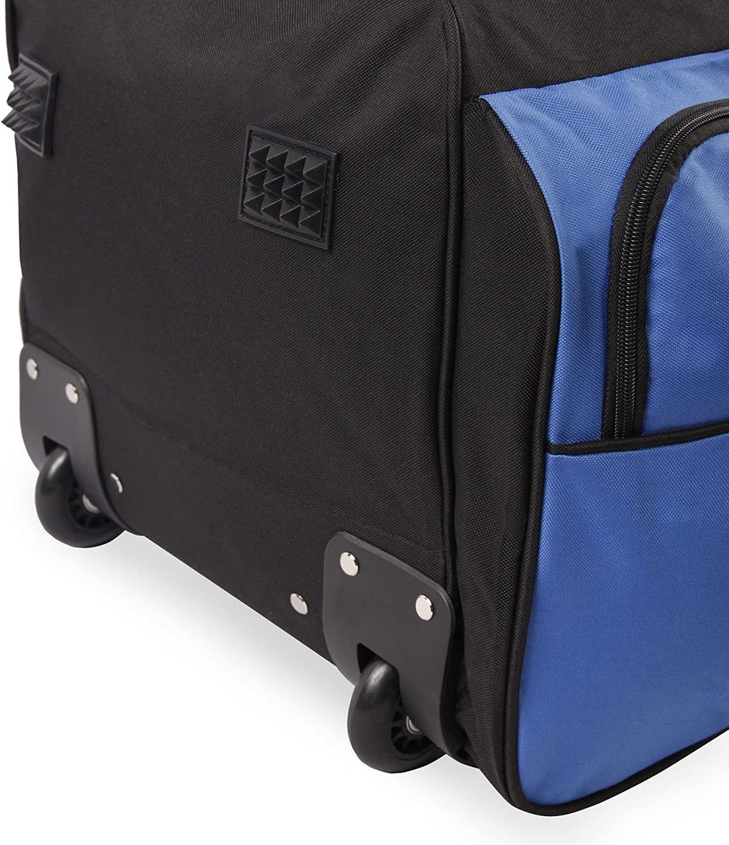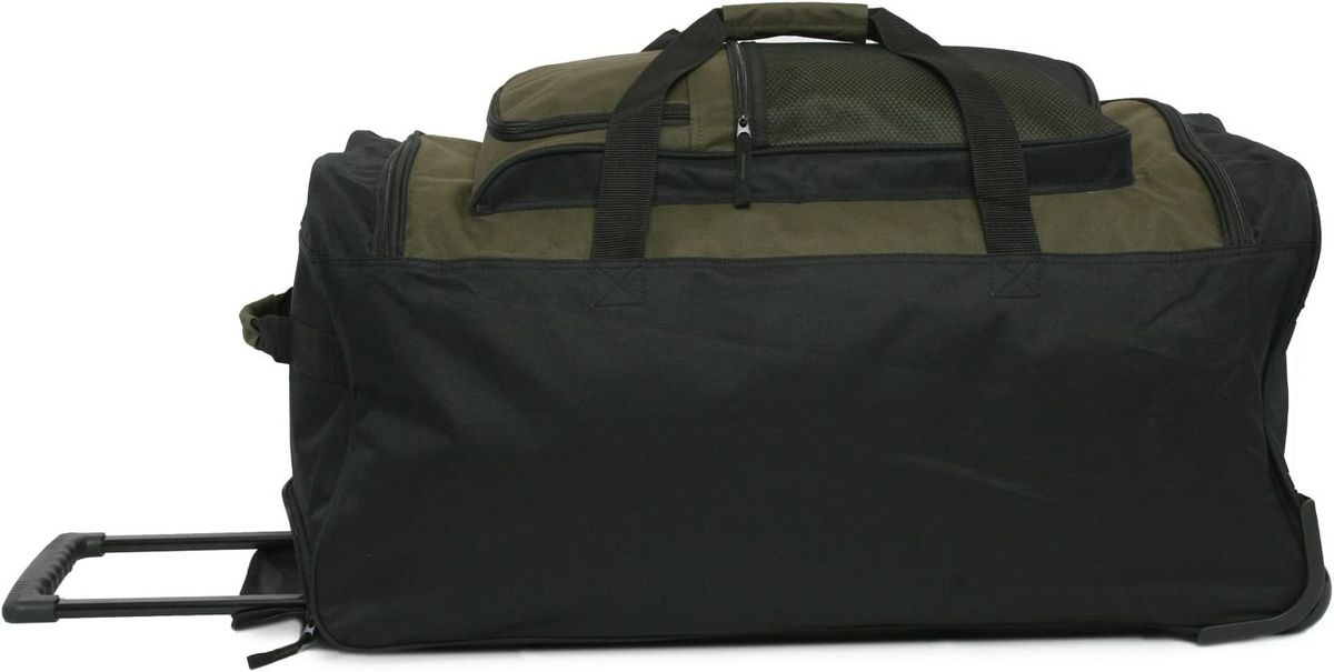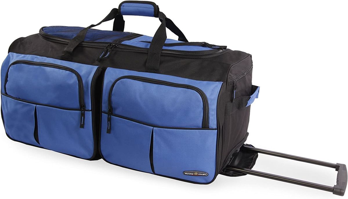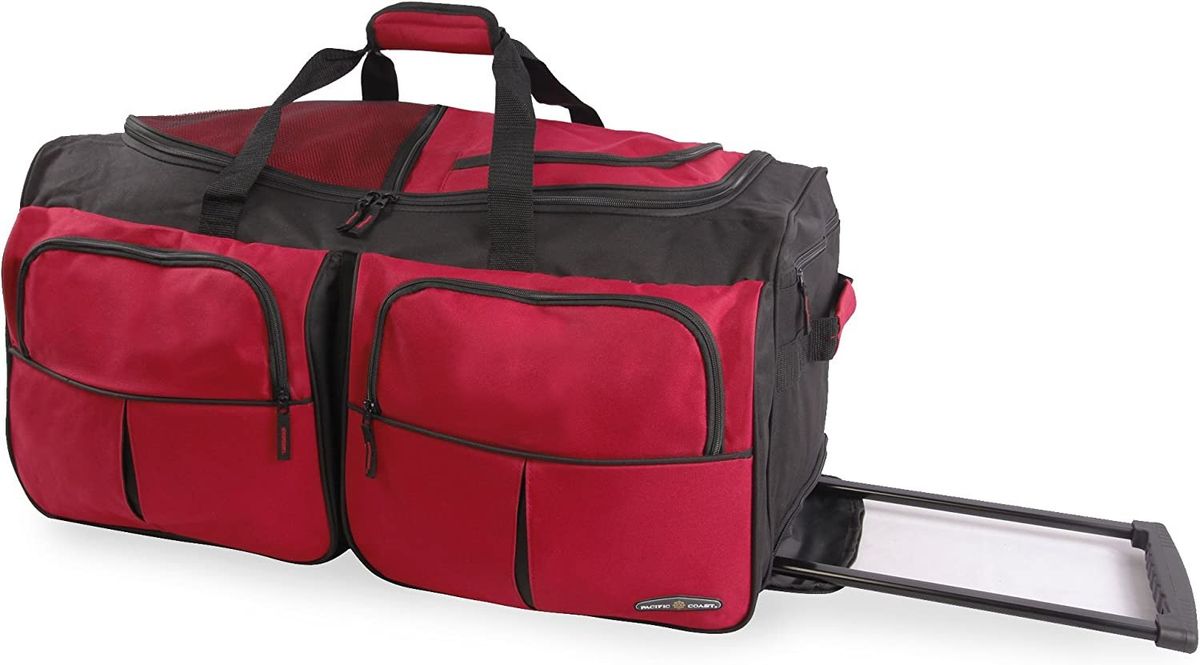 - Large rolling duffel made of durable polyester with 7 zippered pockets.