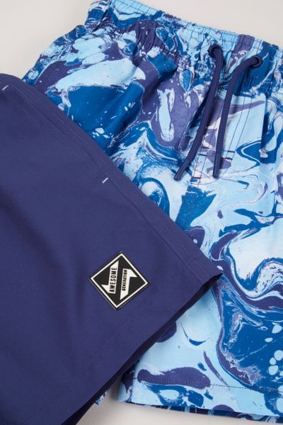 2 pack plain & ocean blue pattern swim shorts. Get them ready for poolside fun and beach trips with these 2 pack swim shorts coming in ocean and deep navy blue. These swim shorts come complete with a mesh lining for comfort and protection as well pockets for essentials and an elasticated waistband