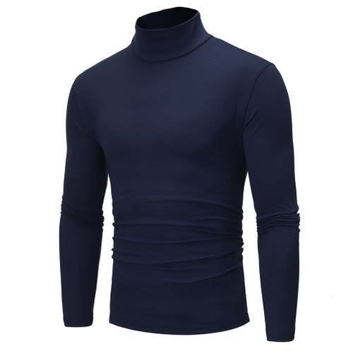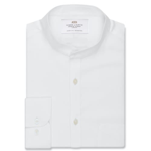A timeless classic with a modern flair, the cotton-blend collarless & lsquo;grandad & rsquo; navy shirt is having a huge revival for everyday styling.