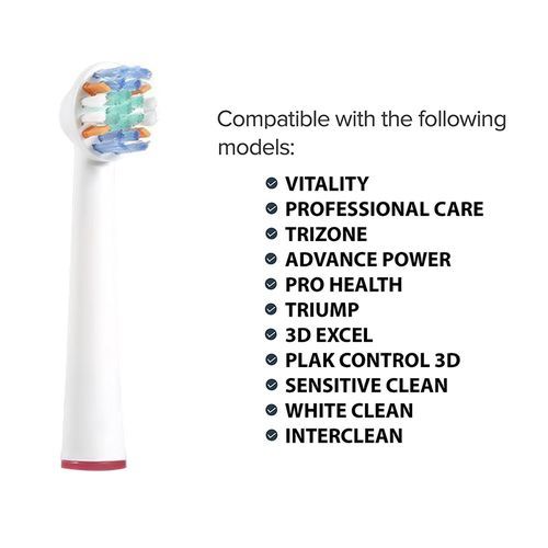 ; ; ; note : if you are not sure which parcel is fit for your brushes model, please contact with us, we will help you ; ; ; Item Description ; ; ; ; ; These are 4pcs so ft brush heads with colored identifier rings. ; Type: YE616,YE618,YE620,YE625 Pack: 4 pcs in one pack ; This Replacement brush head Fits The Following Handles: Compatible With The Following Electric Toothbrushes: • Vitality Precision Clean (All Models) • Vitality Dual Clean (All models) • Professional Care (All models) • Professional Care SmartSeries (All models) • TriZone (All models) • Advance Power (All models) • Pro Health (All models) • Triumph (All models) • 3D Excel (All models) • Plak Control 3D - Duo - Travel • Triumph Professional Care (All models) • Triumph (All models) • Sensitive Clean (All models) • White Clean (All models) • Interclean (All models) • Pro-Health (All models) ; *PLEASE NOTE: Our toothbrush heads are NOT compatible with Vitality Sonic - CrossActino Power - Sonic Complete - Pulsonic ; Please replace your brush head every 3 months for a better clean. ; Package: 4pcs Toothbrush Heads (4pcs/set) -------------------------------------------------------------------------------------------------------- ; ; ; ; ; ; ; ; ; ; ; ; ; ; ; ; ; ;