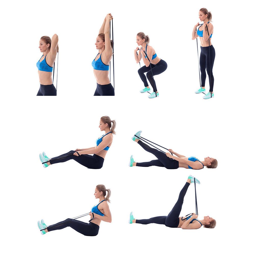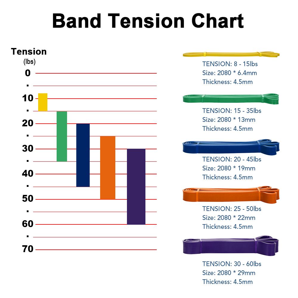 Pack of 5 resistance bands with different colors, width and resistance levels: 6.4mm (8-15lbs), 13mm (15-35lbs), 19mm (20-45lbs), 22mm (25-50lbs), 29mm (30-60lbs). Please note the colors are sent by random.