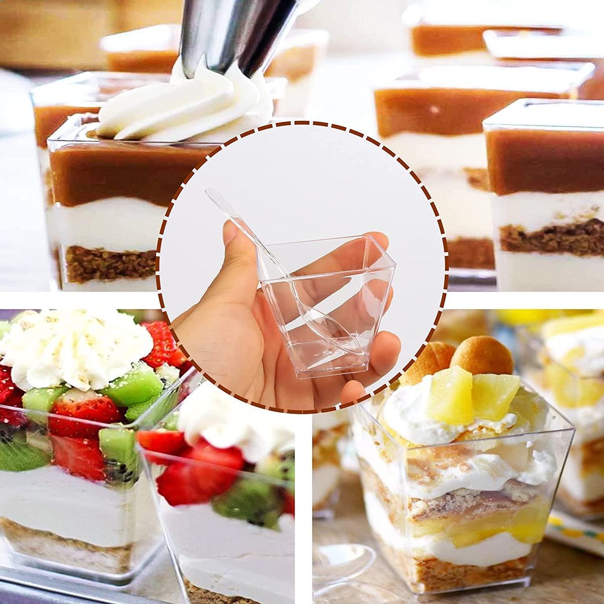 Detailed Information About The Product:You will receive 50 dessert cups with spoon, cup base: 3 x 3 cm, capacity: 2 oz (60 ml).
