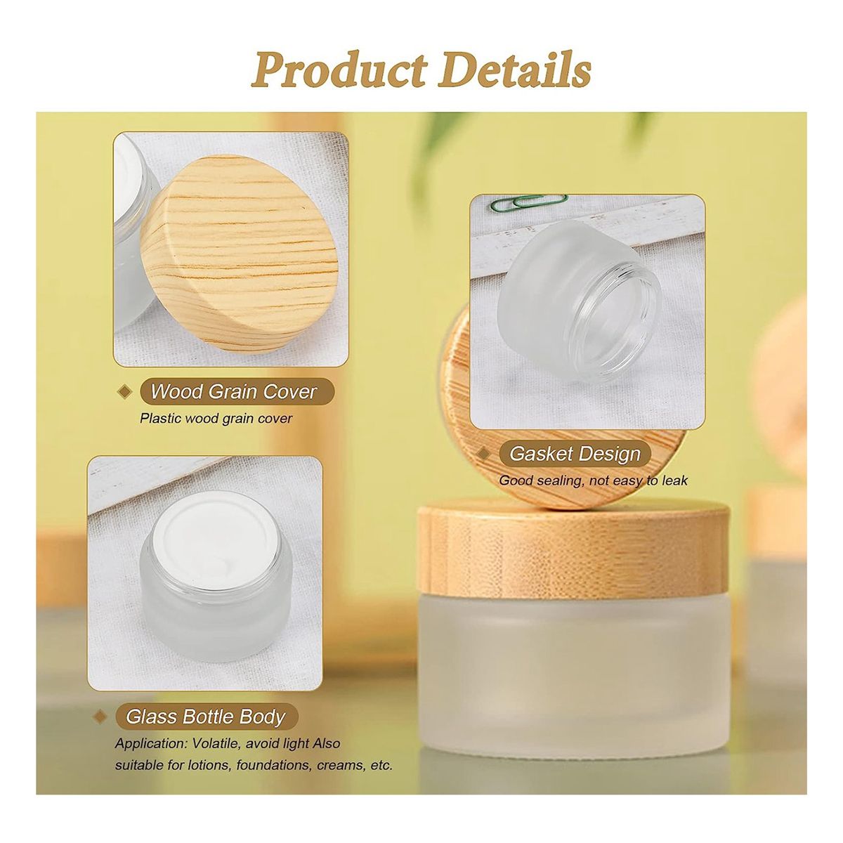 Leak-proof design: 30 ml glasses frosted glass and wooden lid, the sealing performance is good, you don't have to worry about cosmetics. Give your belongings a good protection for your belongings when the lid is screwed securely onto the container.
