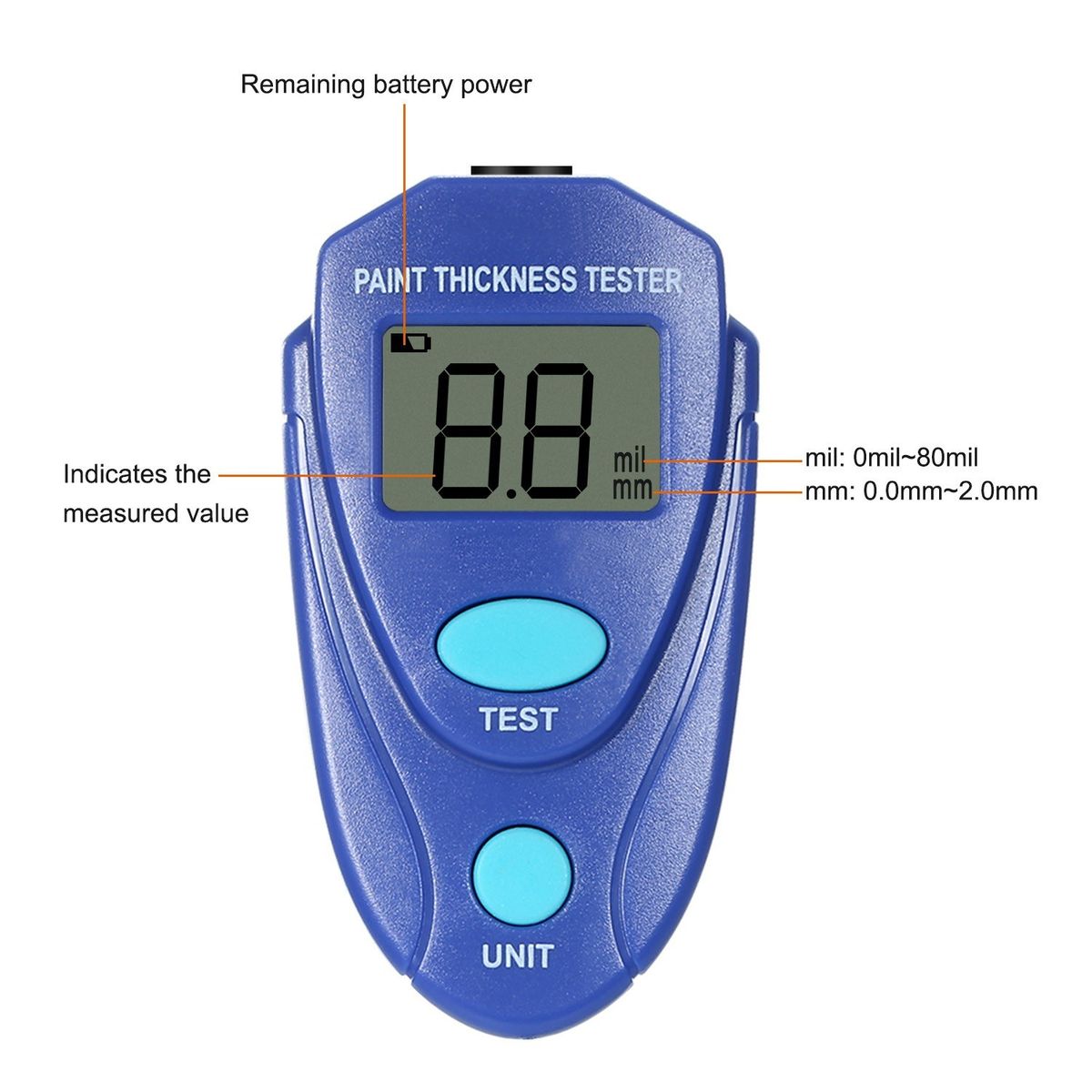 Measuring range is 0.0 ~ 2.0mm or 0 to 80mil.