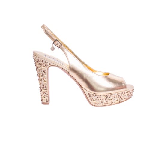 Palmeri are into production of exclusive women shoes and bags, made from the finest quality high-end material; this shoe is made from leather and fabric material and adorned with gold stones and gold metal accessories.