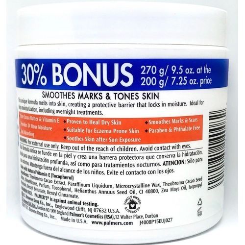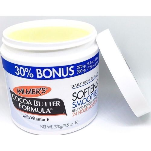 Nourish your skin with Palmer's Cocoa Butter Formula. Rich and luxurious, it provides deep hydration all over. This unique lotion melts into skin, creating a protective barrier that locks in moisture. From normal to dry to eczema-prone skin, this emollient-rich solid effectively heals and softens, leaving skin smooth, supple and beautiful. This cocoa butter formula lotion is ideal for overnight treatments. Use it on your hands, arms and legs. It contains vitamin E, which refreshes and soothes rough and dry skin. It also helps reduce the appearance and visibility of marks and scars.
