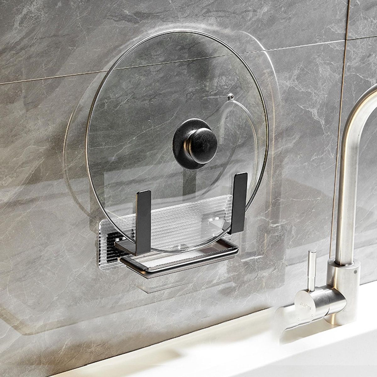 The wall-mounted pot lid holder can keep the pot cover stably hung on the wall, saving kitchen space. And you don't need to worry that it will damage the wall since it is punch-free.