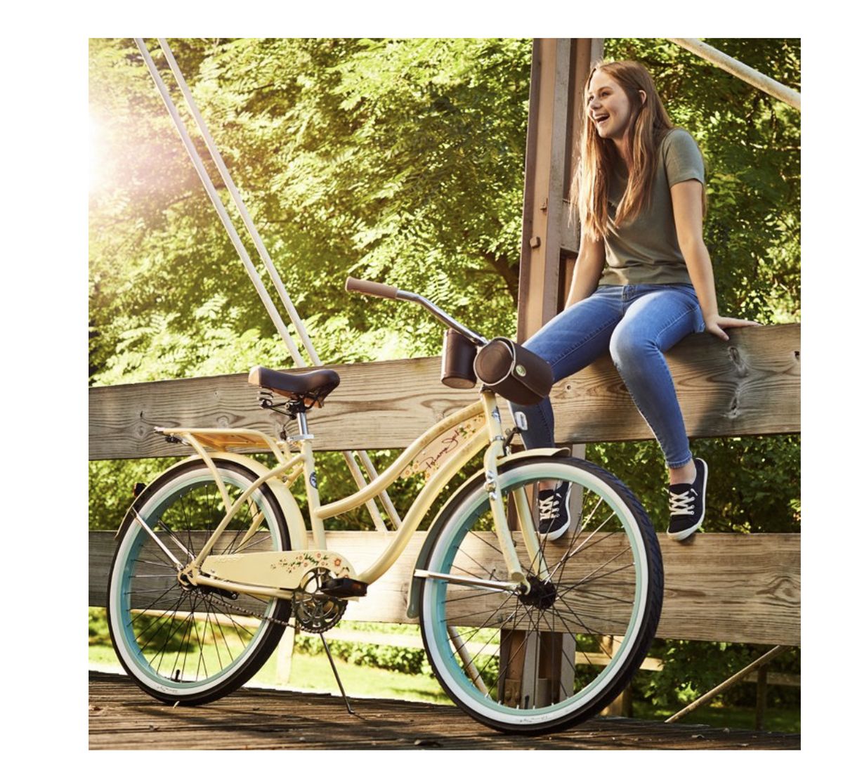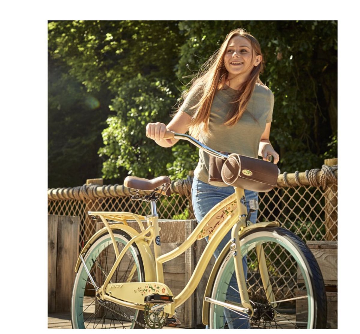 Panama Jack 26-inch Beach Cruiser. Nothing says, "fun at the beach" quite like Panama Jack Beach Cruiser. You can capture the same feeling every time you take a ride on your 26-inch bike from Huffy. The bike combines awesome convenience features and total comfort with the beach style. A beverage holder is conveniently attached to the handlebar. Keep your favorite beverage close at hand while you ride. When you need to keep things secure, soft sided bag attaches to the front of the bike for grab and go convenience. Of course, the most unique accessory on the Huffy Panama Jack is the bottle opener on the fork. Now you're ready to relax at the beach! Carrying things around campus or into town is easier with the adjustable rear rack. A wood design topper makes the rack the perfect place to add a pack, books, you name it.Now you're ready to relax at the beach! Comfort and style are big reasons why everyone likes to ride cruisers. The spring saddle is padded for comfort for a great ride. Comfort grips feel great and match the wood design accents on the bike. Two-color dual-density pedals add premium comfort and a great look while you ride. Keeping it easy to ride, the cruiser is single speed with a coaster brake. Enjoy the beach style, comfort ride of the Huffy Panama Jack cruiser. From Huffy, We Make Fun.