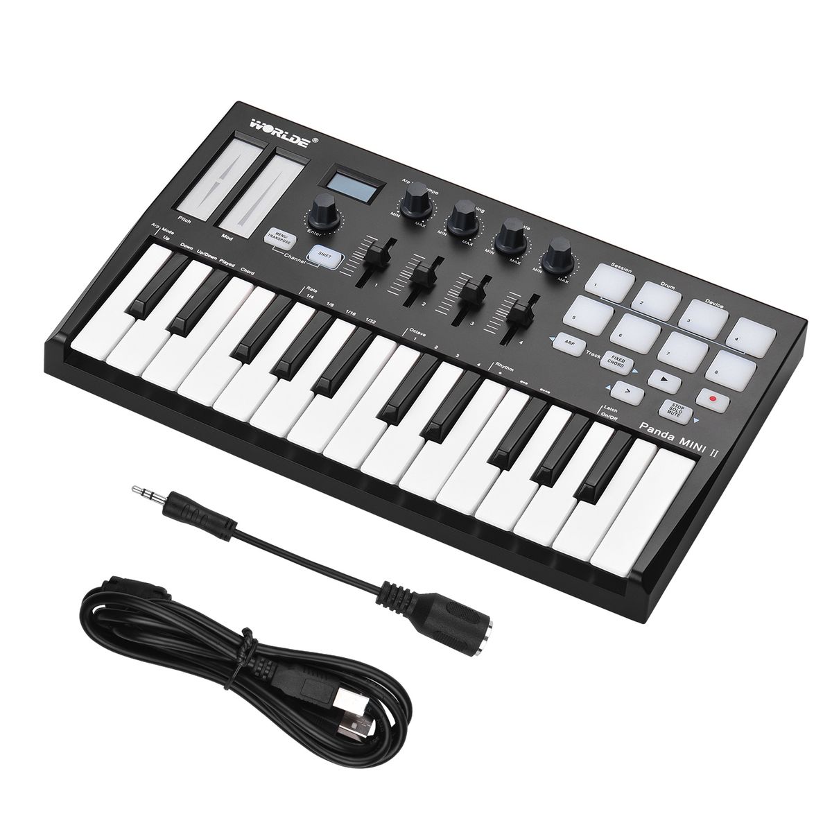 Features:25 velocity sensitive mini-keys, with 3 velocity curve and 1 constant velocity; 4 assignable rotary knobs and 4 assignable sliders, each can be edited by users.