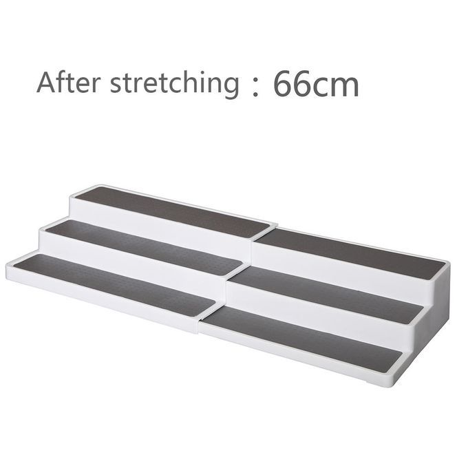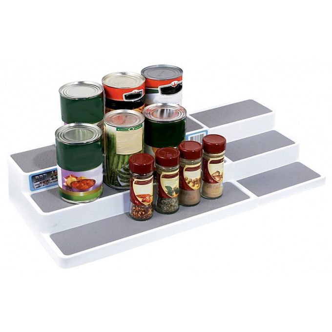 This 3 - Tier Spice Rack provides sufficient space for a number of items while allowing for an organized pantry , cabinet , shelf or countertop . The neutral , white and gray color scheme will seamlessly blend in with any existing decor .