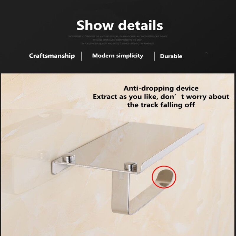304/201 stainless steel bathroom tissue holder roll holder mobile phone tissue box toilet paper holderFeatures:-Wall Mounted Toilet Paper Holder with Shelf-Made of stainless steel material, durable and waterproof.-Curved hook for holding toilet paper to prevent tissue loss.-Storage shelf with baffle design for preventing mobile phone from -slipping.-Suitable for homes, hotels, restaurants, bars, public toilets and so on.Installation:?Hold the holder up against the wall and mark where the holes will be made.?Drill holes on the wall.?Push the anchors into those holes. If need to tap anchors in wall do so lightly..?Hold the holder up so that the holes in the holder line up with the anchors in your wall, screw in the screws.?Condition: ?Material: Stainless Steel?: Silver,Black()?Product size (L x W x H): 18.000 x 9.400 x 7.00 cm / 7 x 3.5 x 2.75inchesPackage Including:1 x Shelf with Tissue Phone Holder,1 x Assembling Kit1 x Box