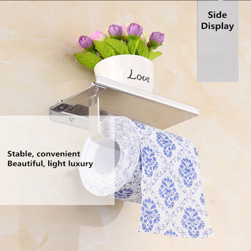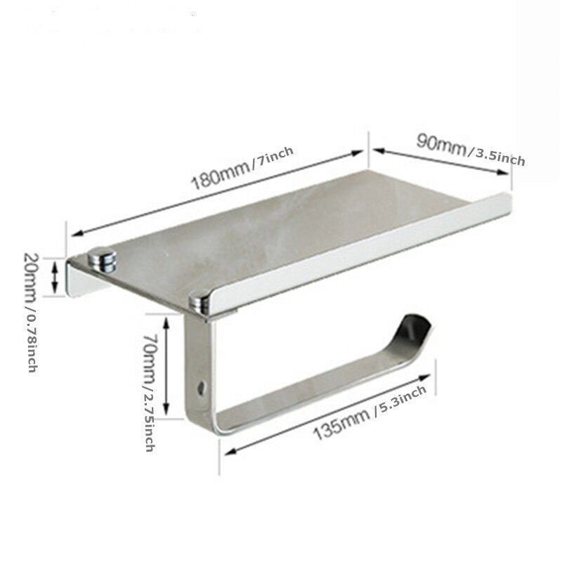 304/201 stainless steel bathroom tissue holder roll holder mobile phone tissue box toilet paper holderFeatures:-Wall Mounted Toilet Paper Holder with Shelf-Made of stainless steel material, durable and waterproof.-Curved hook for holding toilet paper to prevent tissue loss.-Storage shelf with baffle design for preventing mobile phone from -slipping.-Suitable for homes, hotels, restaurants, bars, public toilets and so on.Installation:?Hold the holder up against the wall and mark where the holes will be made.?Drill holes on the wall.?Push the anchors into those holes. If need to tap anchors in wall do so lightly..?Hold the holder up so that the holes in the holder line up with the anchors in your wall, screw in the screws.?Condition: ?Material: Stainless Steel?: Silver,Black()?Product size (L x W x H): 18.000 x 9.400 x 7.00 cm / 7 x 3.5 x 2.75inchesPackage Including:1 x Shelf with Tissue Phone Holder,1 x Assembling Kit1 x Box