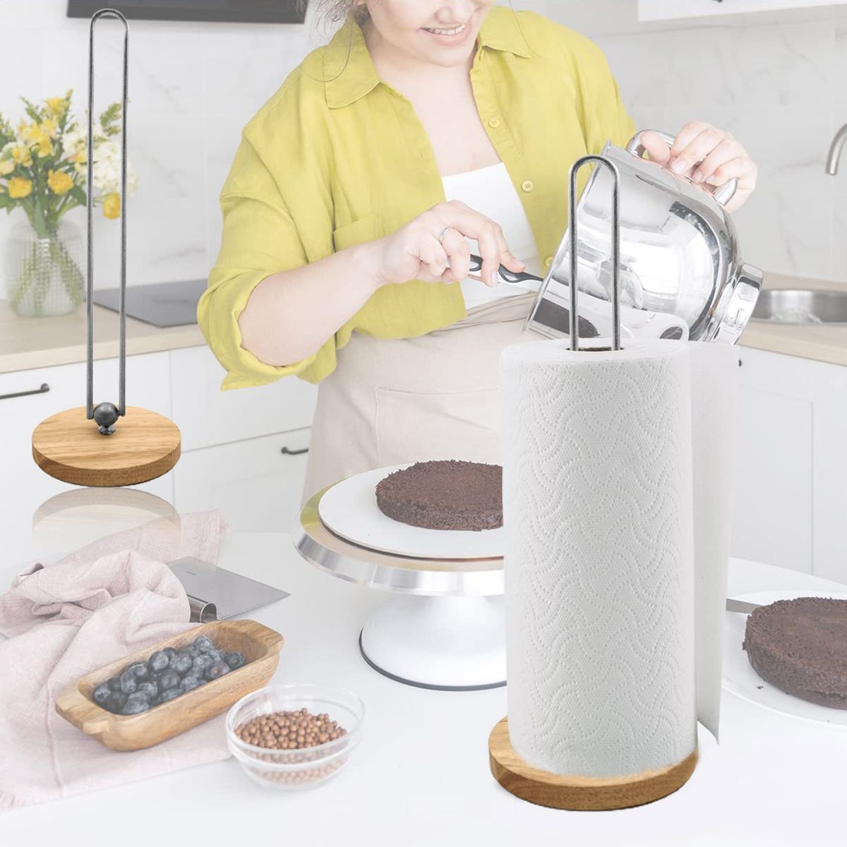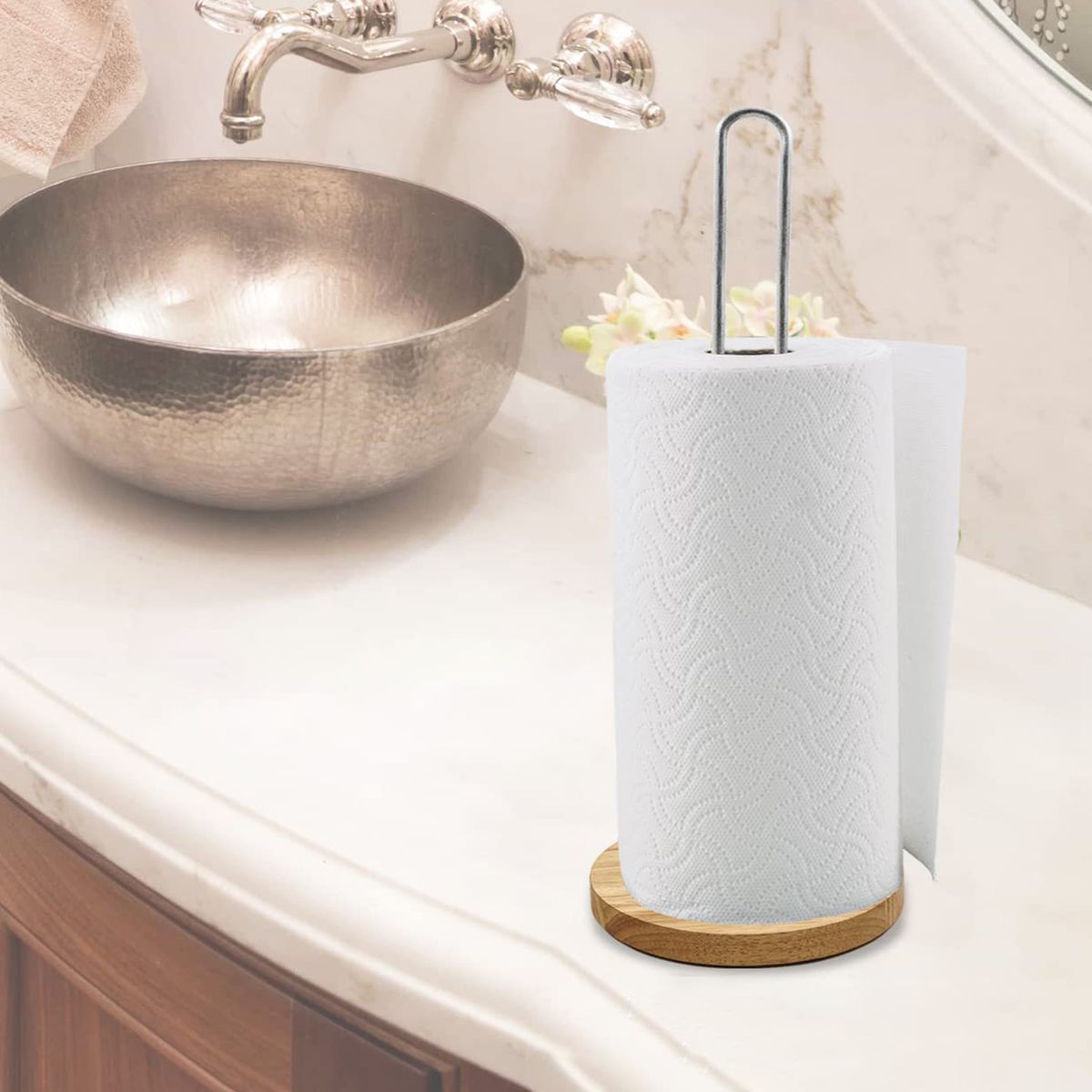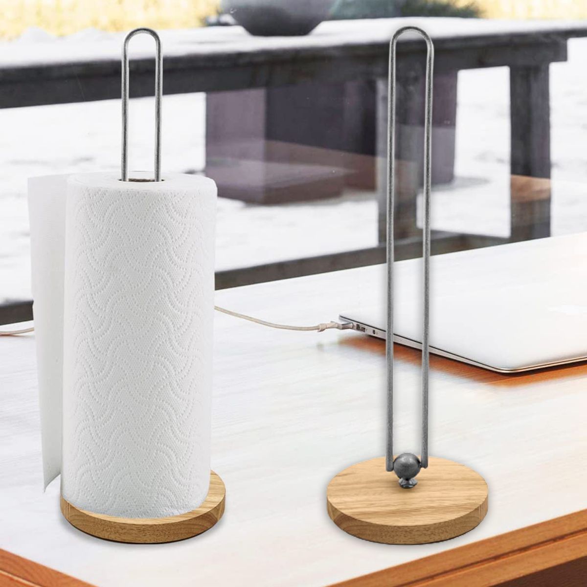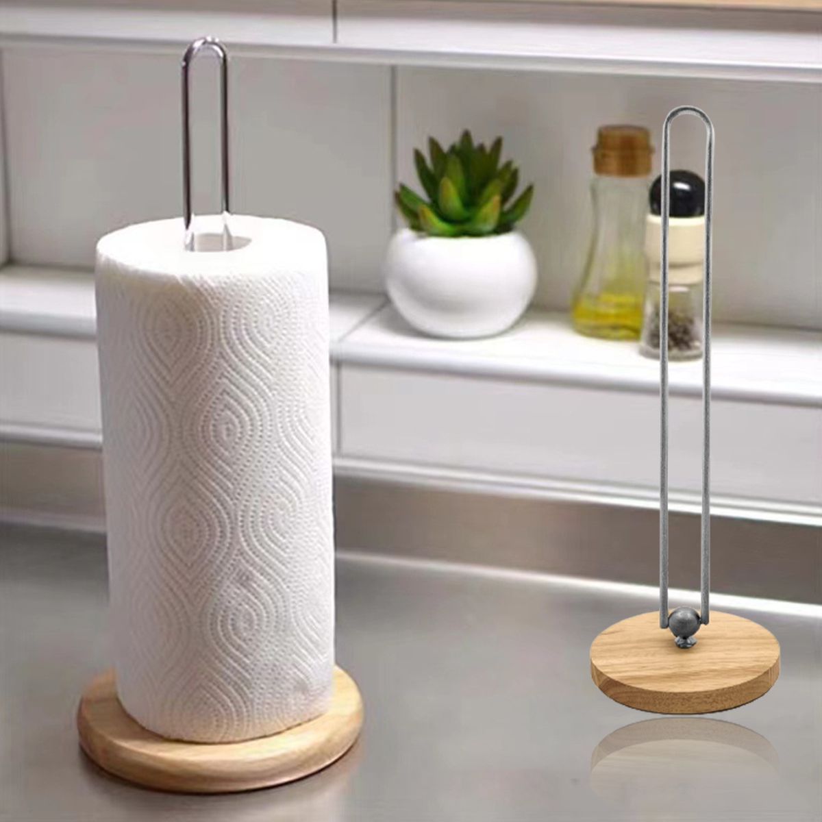 The punch-free design allows you to quickly install this roll holder, saving time and effort. The solid wood base is heavy enough and non-slip, so that the stand is not easy to move when you use paper towels.