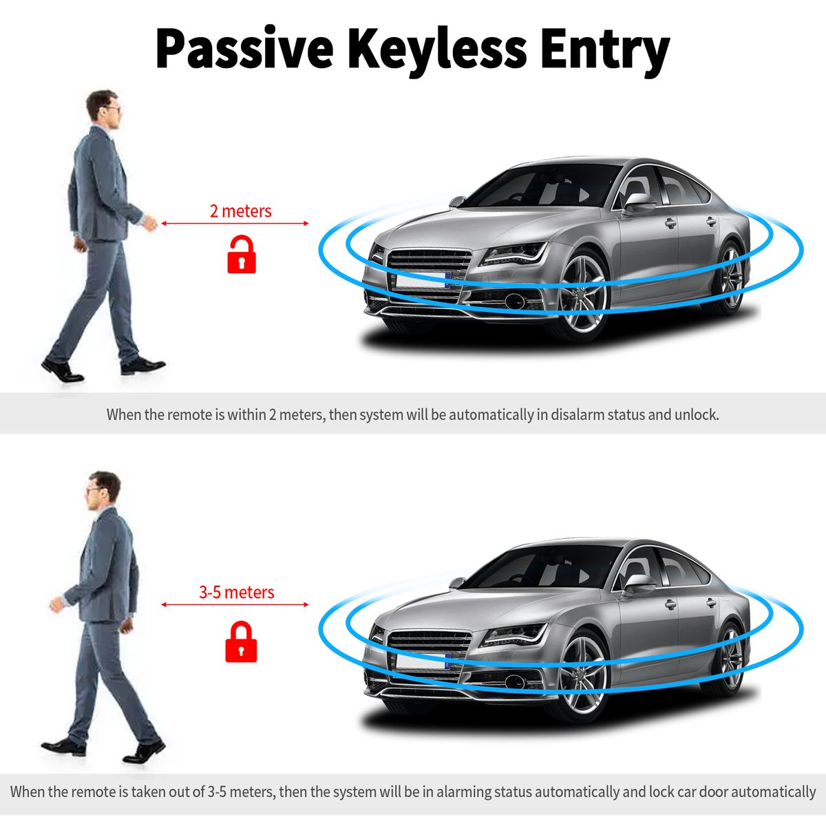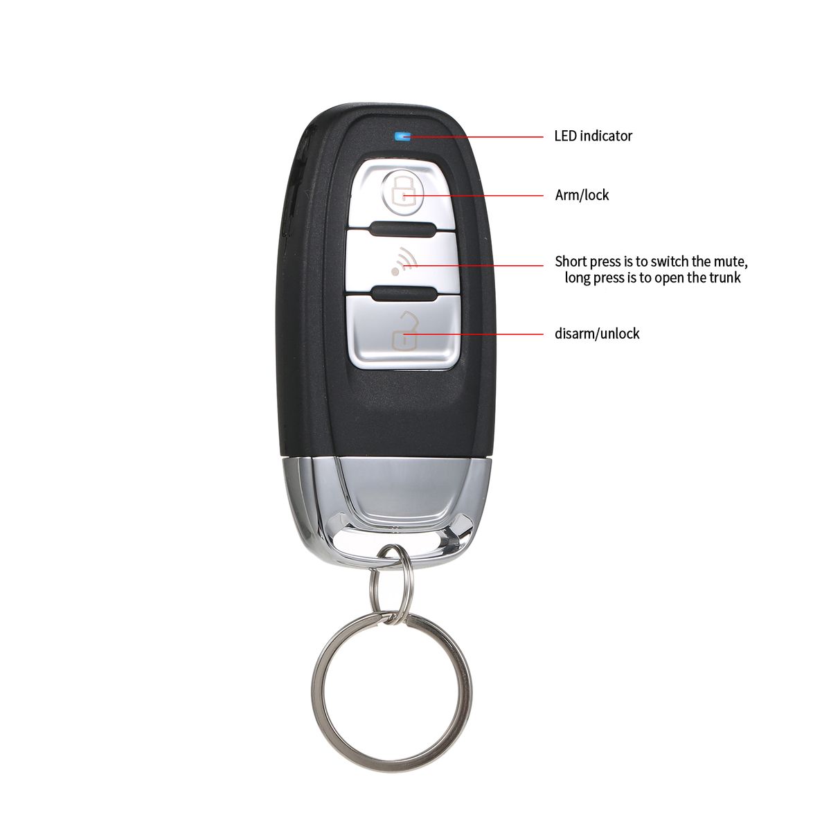 Keyless Entry: When the remote is within 2 meters, then system will be automatically in disalarm status and unlock. When the remote is taken out of 3-5 meters,siren will sound one time, then the system will be in alarming status automatically and lock car door automatically under the mute mode, siren not sounds.