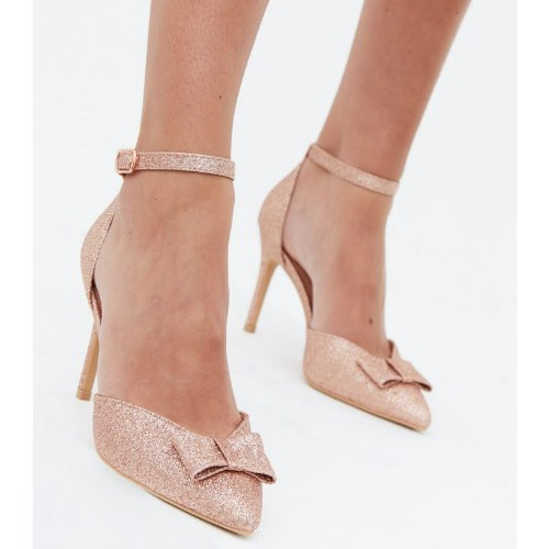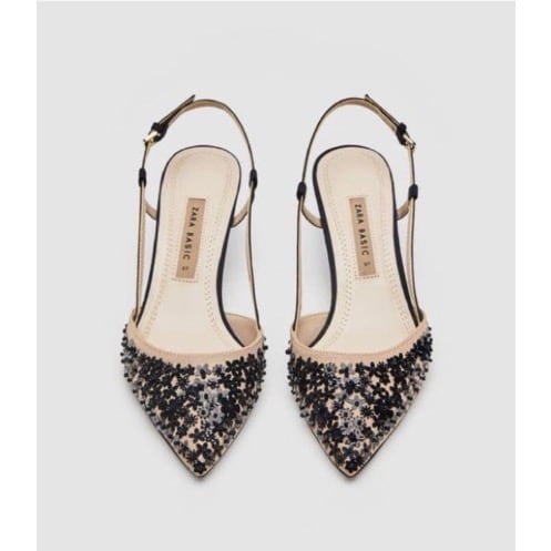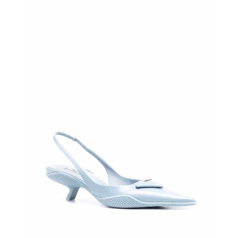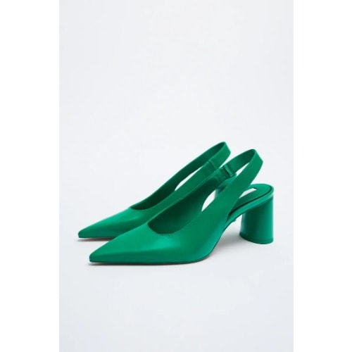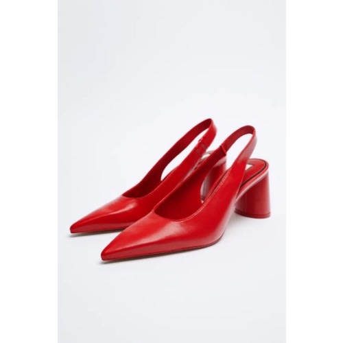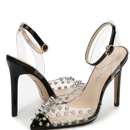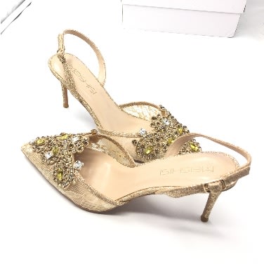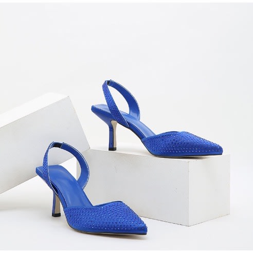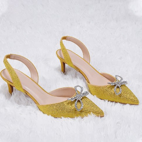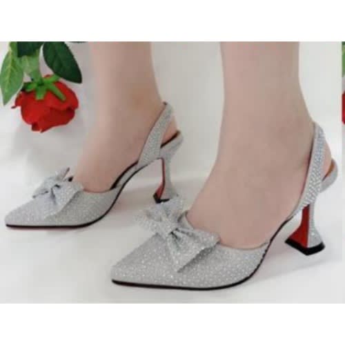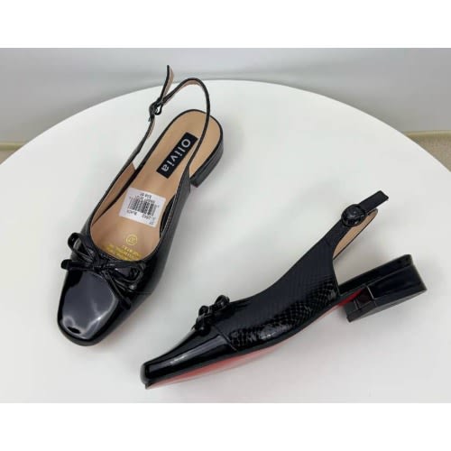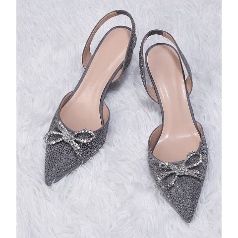 Step out in this beautiful pointed toe round metal detail bow slingback patent shoes.