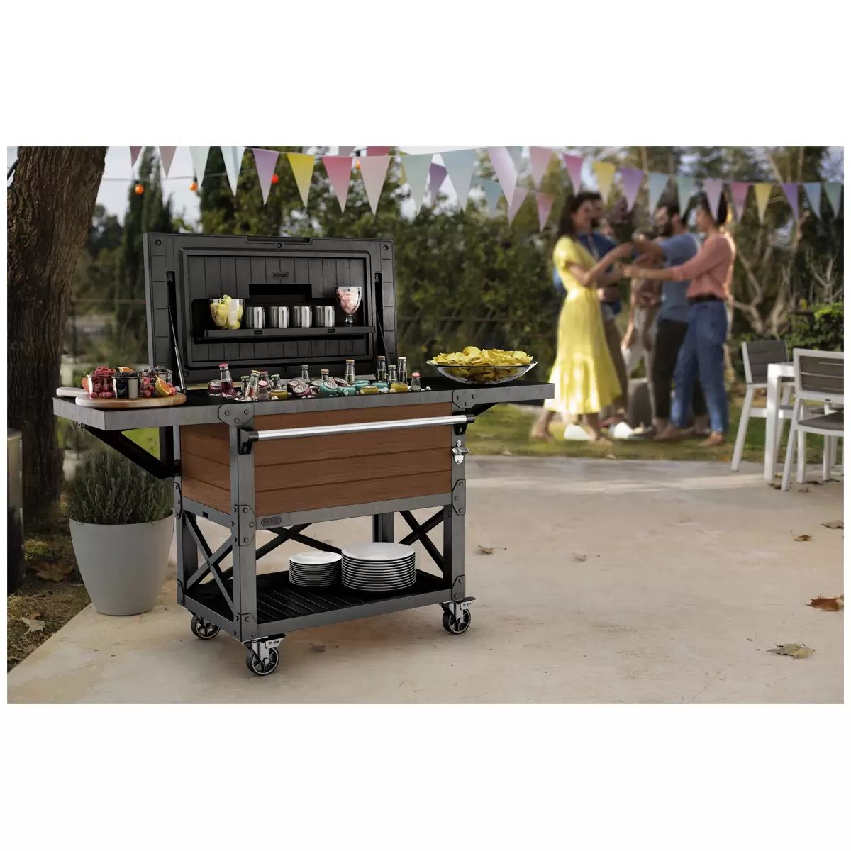 When you're hosting a party (barbecue), the two stars of the show are the food and the drinks. You could pull out the dingy camping cooler, but it doesn't have wheels and is a huge pain to move around - not to mention an eyesore. So, get the patio cooler cart. This sleek outdoor drink cooler is the ultimate way to keep drinks cool and refreshing. It's also on wheels. So, you can roll it into the kitchen or garage to fill it up with drinks. Then simply roll it outside to where you're entertaining. This drink cooler is easy to clean and is super sturdy. It is made of Resin It includes counter space for extra snacks and a bottle opener. With cool, easily accessible drinks, the party will be a huge success!