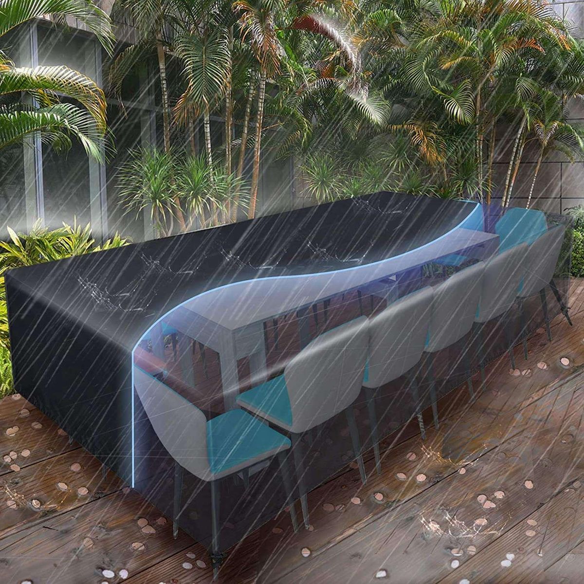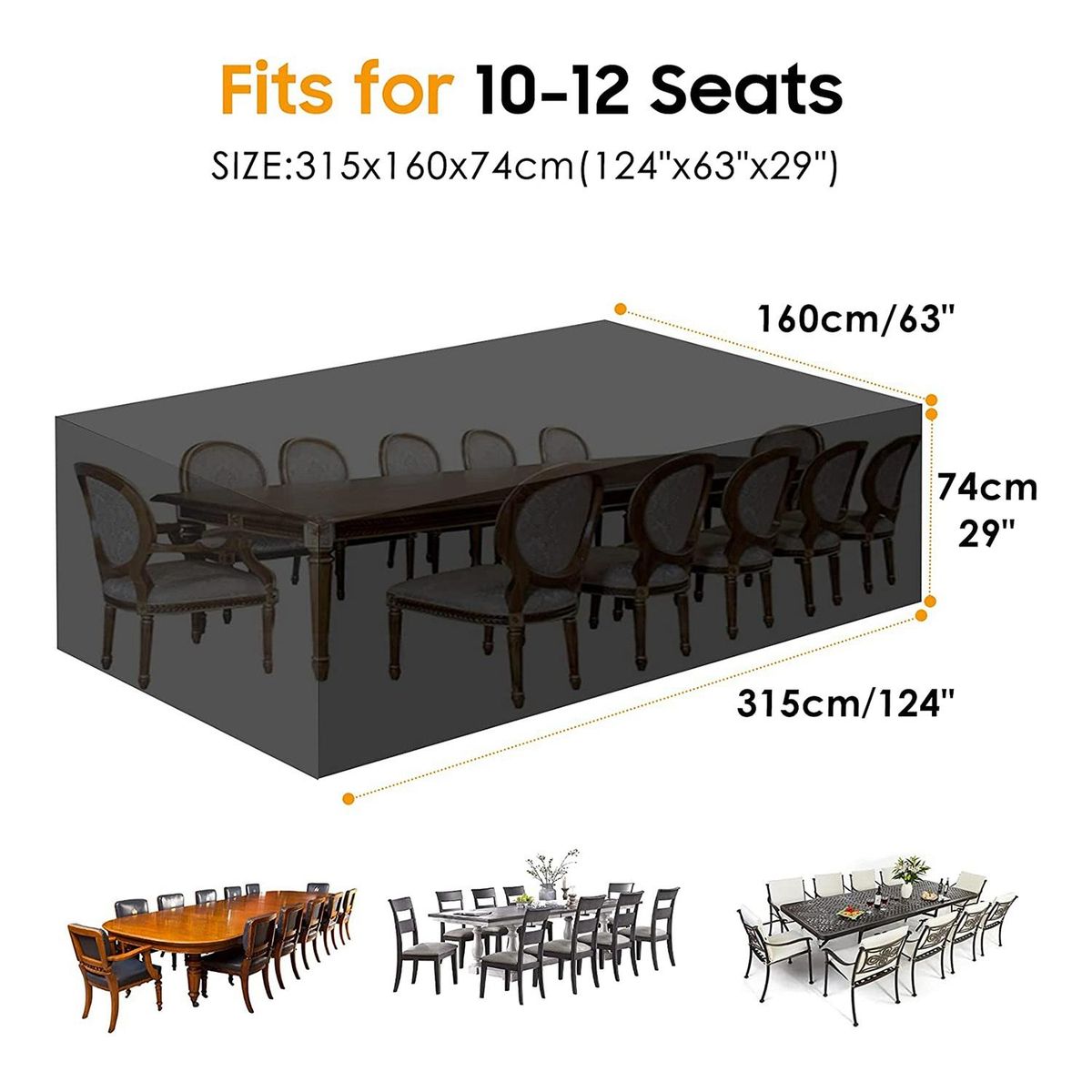 Detailed Information About The Product:[Universal Size]This cover measures 315x160x74CM. It fits most furniture such as coffee tables, benches, coffee tables, chairs, round or oval patio dining sets, 8-12 chairs, or 6-8 person sofa sets. Please measure the size of your furniture set before purchasing.