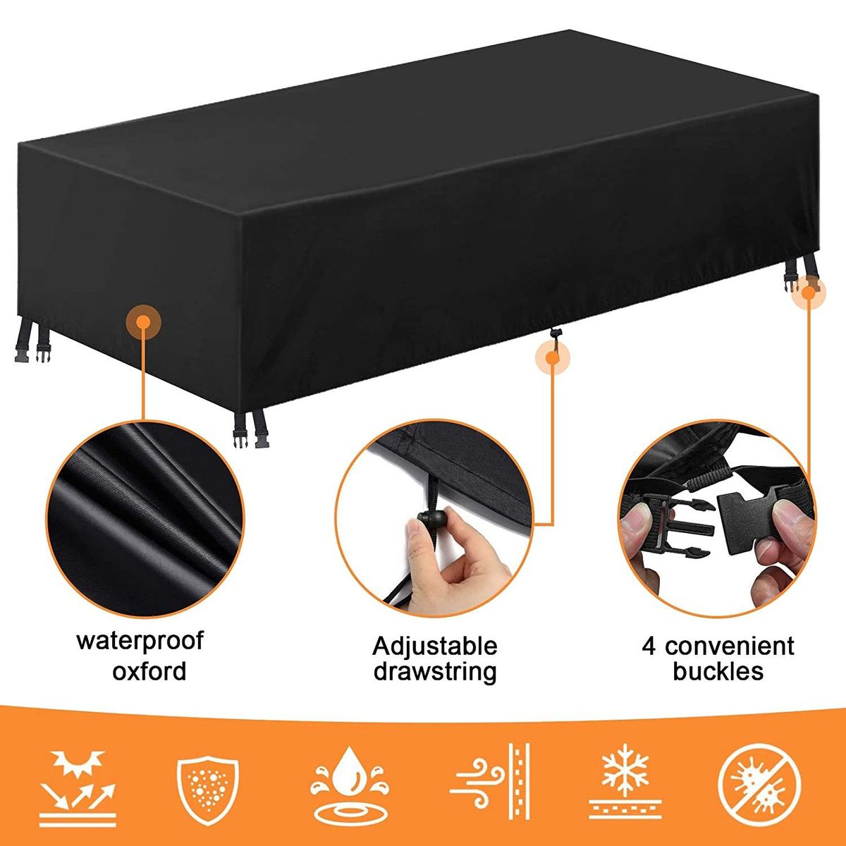 [Tear and UV Resistant]We developed a high quality patio furniture cover with 210D material strictly stitched and PU coated with waterproof tape at the seams. Keeps your furniture dry. It also protects your furniture from rain, snowstorm, dust, falling leaves, scratches.