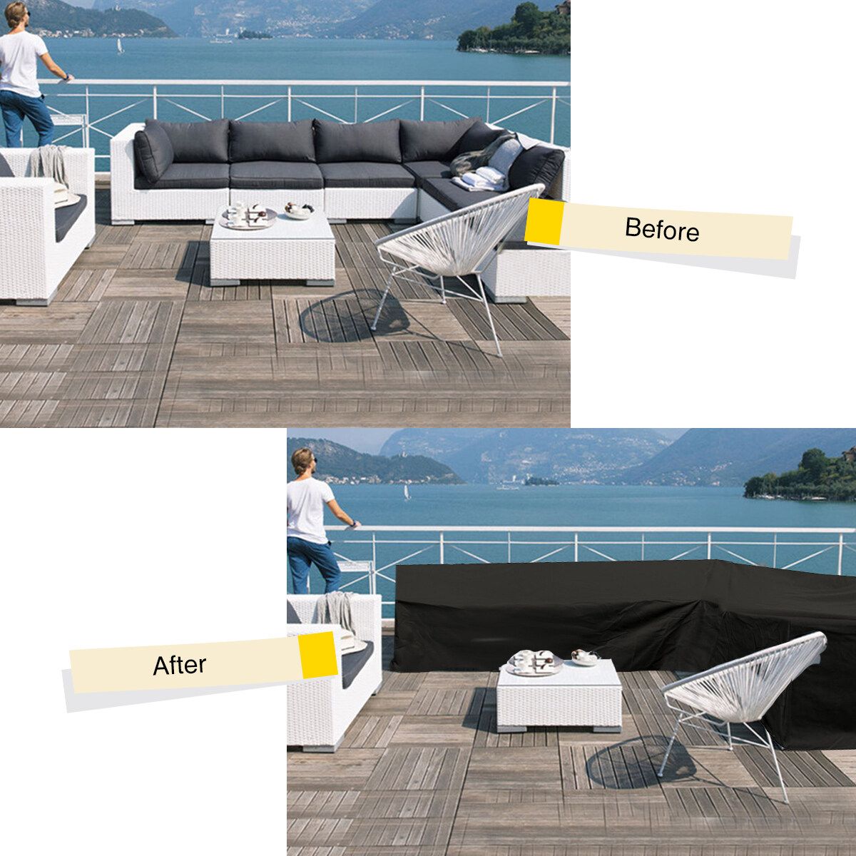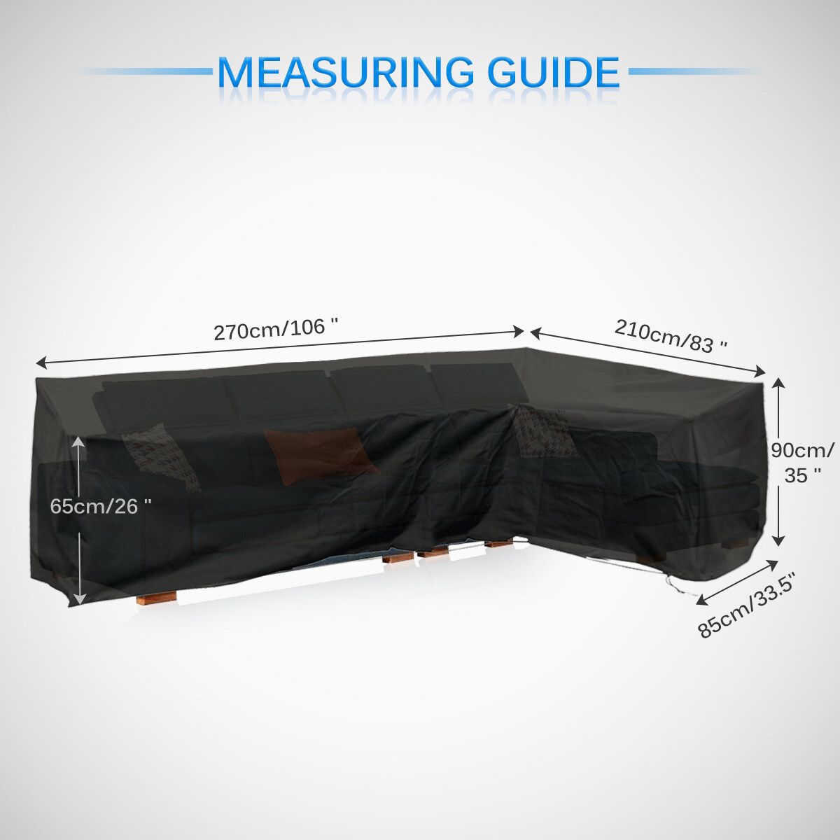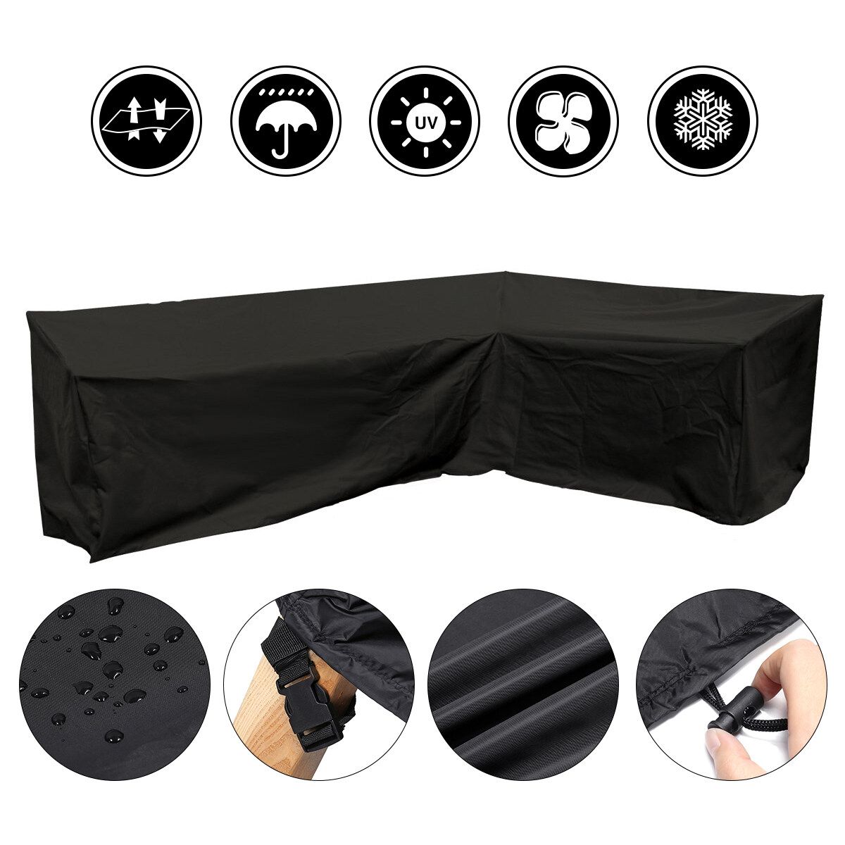 DURABLE MATERIAL: Designed with heavy-duty polyester material, moisture-proof and UV resistant. This will protect your furniture from dirt, dust, damp and unwanted substances. WATERPROOF COVER: Outdoor furniture cover with waterproof material, excellent waterproof performance and good resistance to high temperature. Besides, the cover can be folded up when not in use, saving storage space for you. GOOD PROTECTOR: The cover will protect your furniture from harsh weather, unlike covers which can fail to protect the patio set long-term, keeping your furniture in the best possible condition. EASY TO CLEAN: Wipes with a damp cloth and the dirt will disappear soon. Let it dry in the sun. With an easy to wash material and tear resistance, you know you're getting great value with this product. WIND-PROOF DESIGN: 4 Pcs Buckles and a drawstring fix the cover firmly on the sofa, and prevent the cover from blowing away by wind. It is desgined in short right wing and long left wing. Please choose carefully before buying.