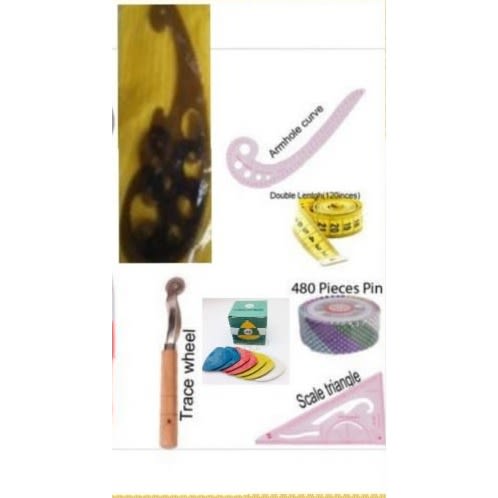 1,rulet 2,pattern sheet 3,hip curve 4seam ripper 5,tracing wheel 6chalk 7,triangle 8,480pin 9armhole 10,tape rule 11,French curves
