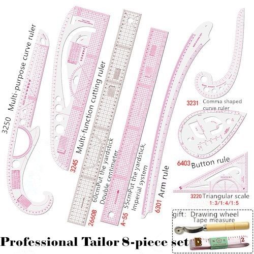 - 1) A 60cm ruler.2) Hip Curve.3) Armhole Curve.4) Scale Triangle.5)Yellow curve ruler6) Double Length Tape rule/ 120inches Tape rule.7) Seam Ripper8) Tracing wheel9) 480pcs of Pins.10) 10 sheets of pattern papers(36by26)