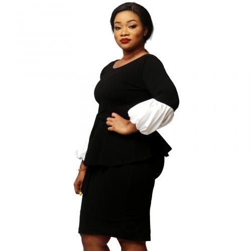 The pauline bundle is a set of black Peplum top made from stretchy jersey fabric,with an off-white contrast puff sleeve detail and a black pencil midi skirt made from stretchy jersey. It is an ideal pair for that corporate chic look.