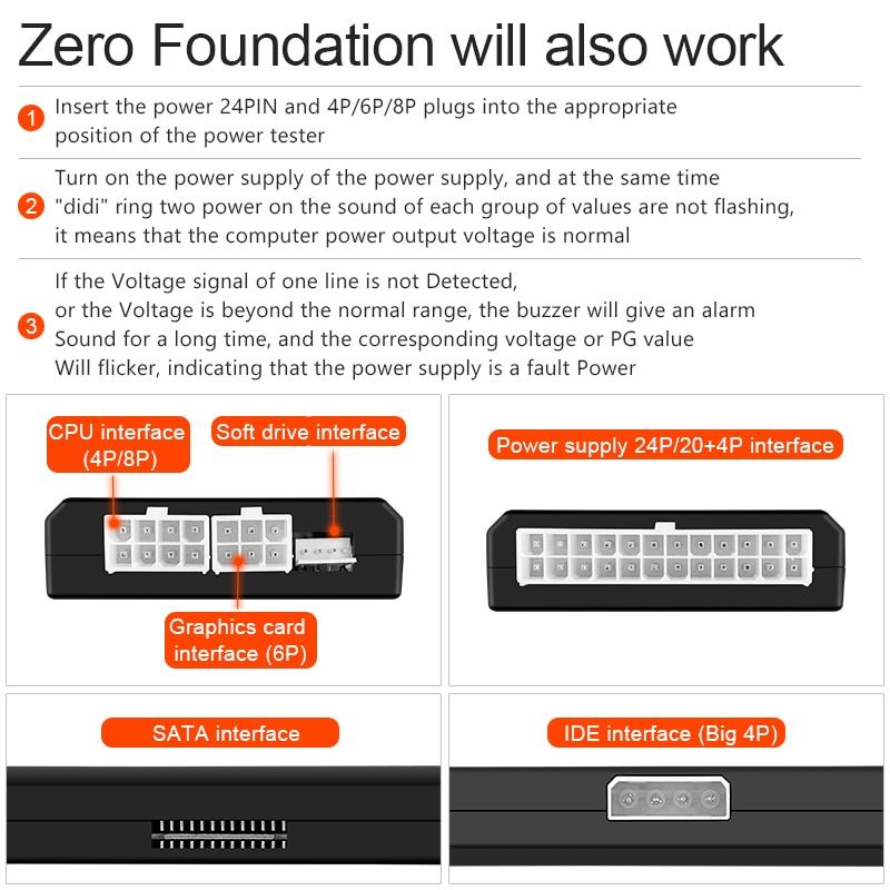 The item is a LCD power supply tester. It can test your power supply and avoid damage to your expensive computer equipment with this power supply tester. The device is suitable for the ambitious hobby user, as well as for a quick functional check in a specialized trade. Features: Housing material: Plastic LCD indicate the status of voltage The power supply tester is a robust voltage tester for PC-power supplies: ATX,X, and ITX compliant power supplies can be tested. Simple and easy to use, no batteries are needed. Connect to the power supply's 20-pin Molex connector. Equipped with +3.3V, +5V, +VSB, -5V, -12V and +12V leads for monitoring voltage output. Operation: 1.Plug power supply 24 PIN and P4 , P6 or P8 into the corresponding jack of the power test suite. 2.Power on the supply of power, will hear "DuDu" ring , if no flicker then the power supply output voltage is normal. 3.If a certain voltage signal was not detected, or the detected voltage value over the normal, will iue a "DuDu" long buzzer ; if the corresponding voltage value or PG flicker too, then the power is failed. Specification: Housing material: Plastic Support 24Pin, ATX 20Pin interface Support SATA interface Support 8Pin, 4Pin interface Support PCI-E graphics 6Pin interface Support the floppy disk interface Support ATE hard disk interface Test voltage: 3.3V, -12V, 12V1, 12V2 + 5 VSB, + 5V, and PG time Size: approx. 126 x 64 x 18.5mm/4.96 x 2.51 x 0.72 inch