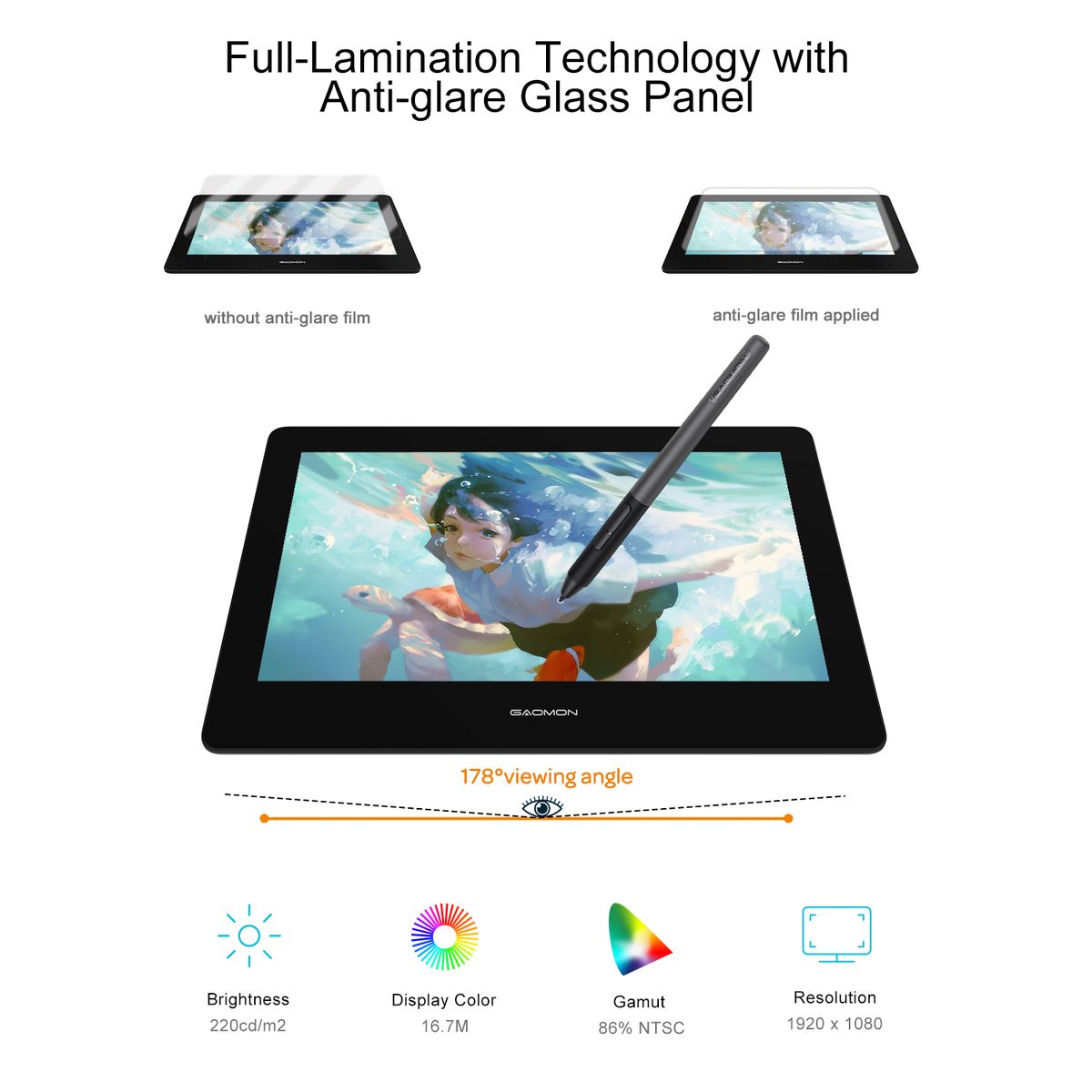 The surface undergoes special processing to make the reflection of the glass surface of the screen become a matte diffuse reflection, which effectively reduces the interference of ambient light, reduces light and shadow, and improves the viewing angle and brightness of the display screen.GAOMON PD1320 uses full-laminated technology, it seamlessly combines the outer screen and inner screen with almost no parallax. Your cursor displays exactly where you want.