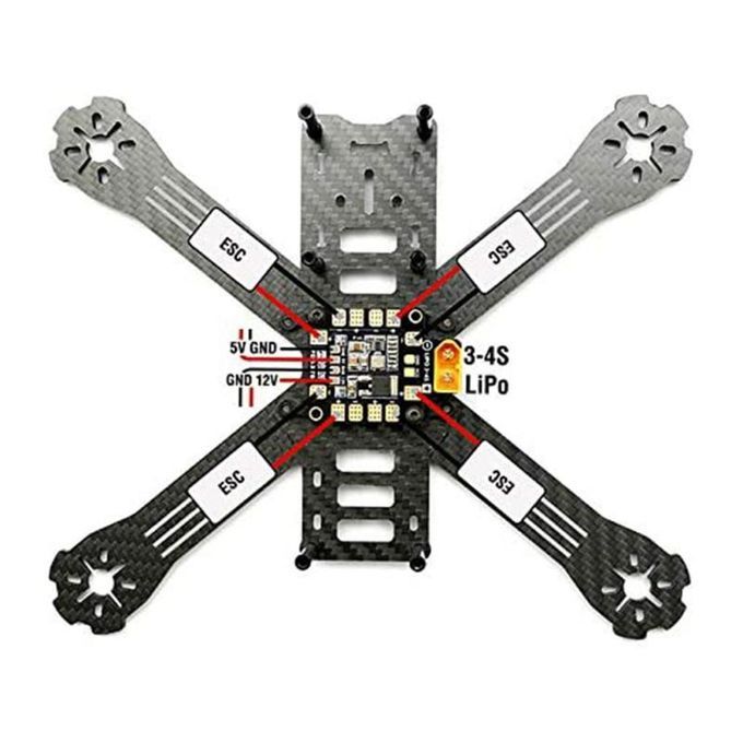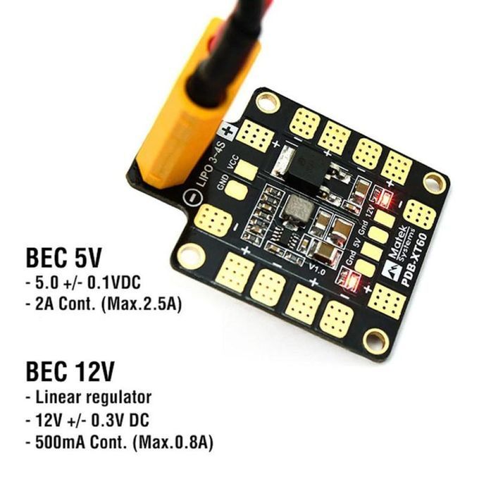 It supplies power for cameras, servos, remote control receivers, flight controllers, video transmitters, LEDs, etc.