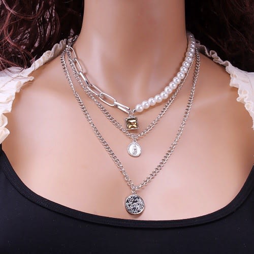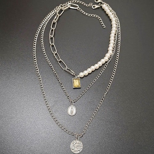 Buy Pearl And Chain Three Layered Necklace- Silver in Nigeria