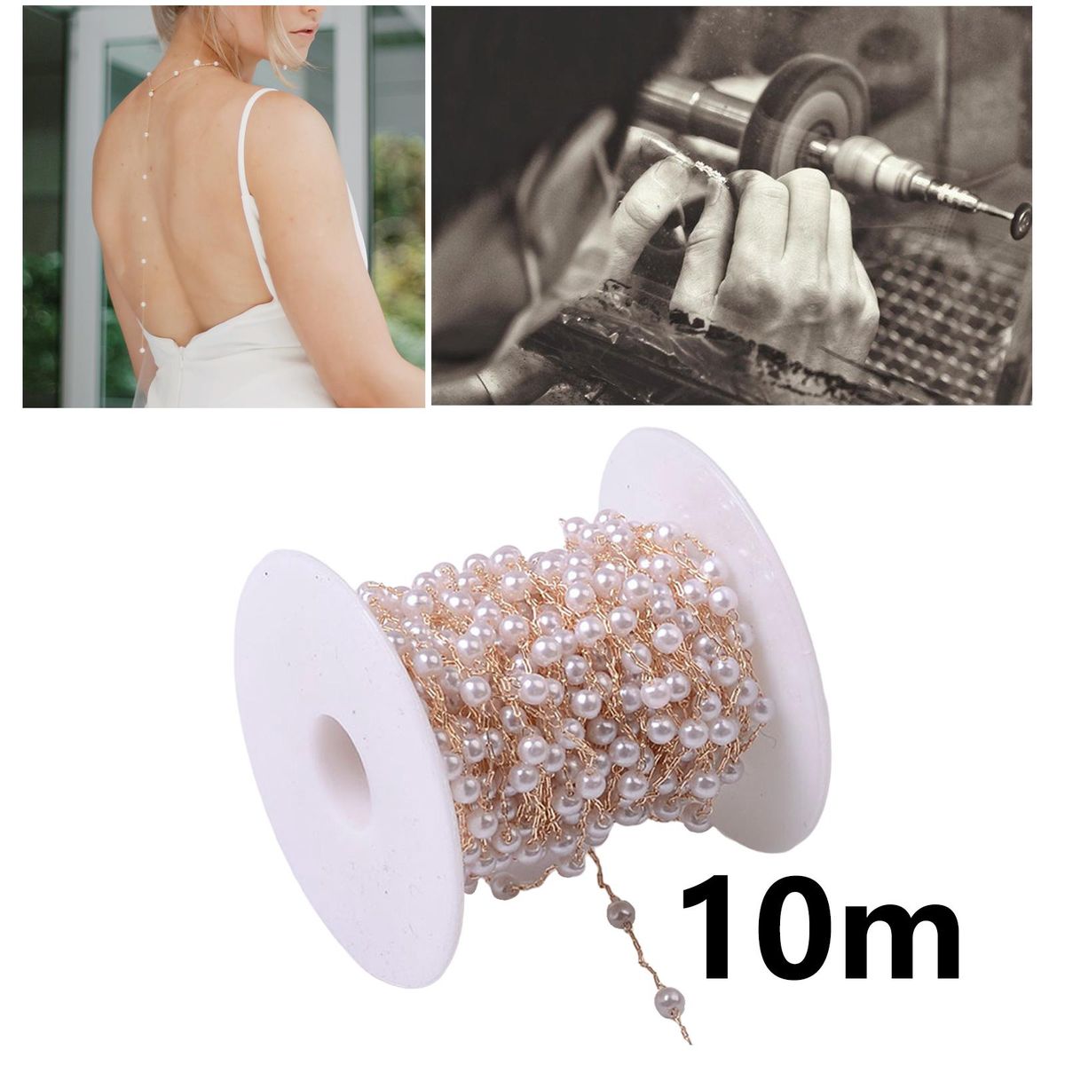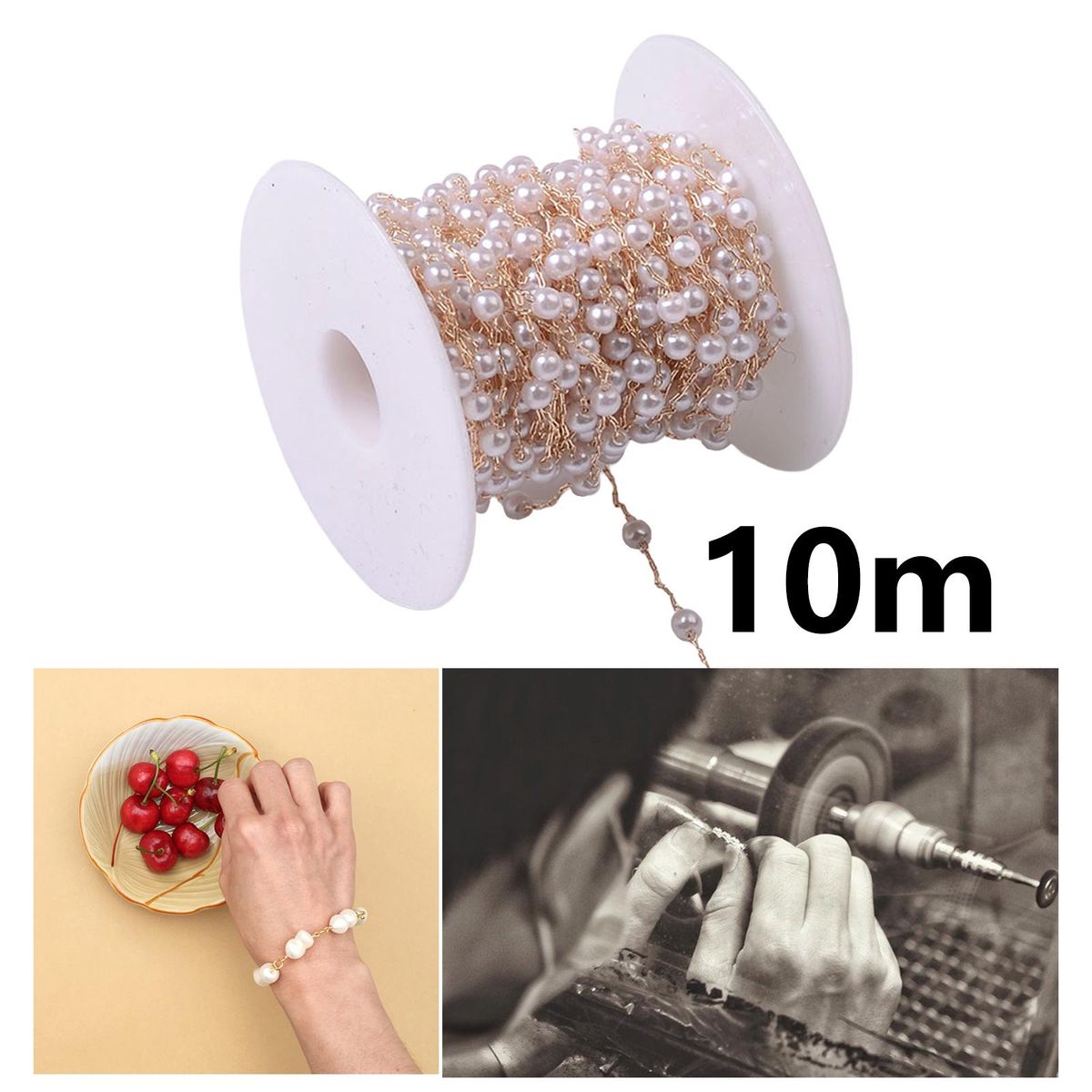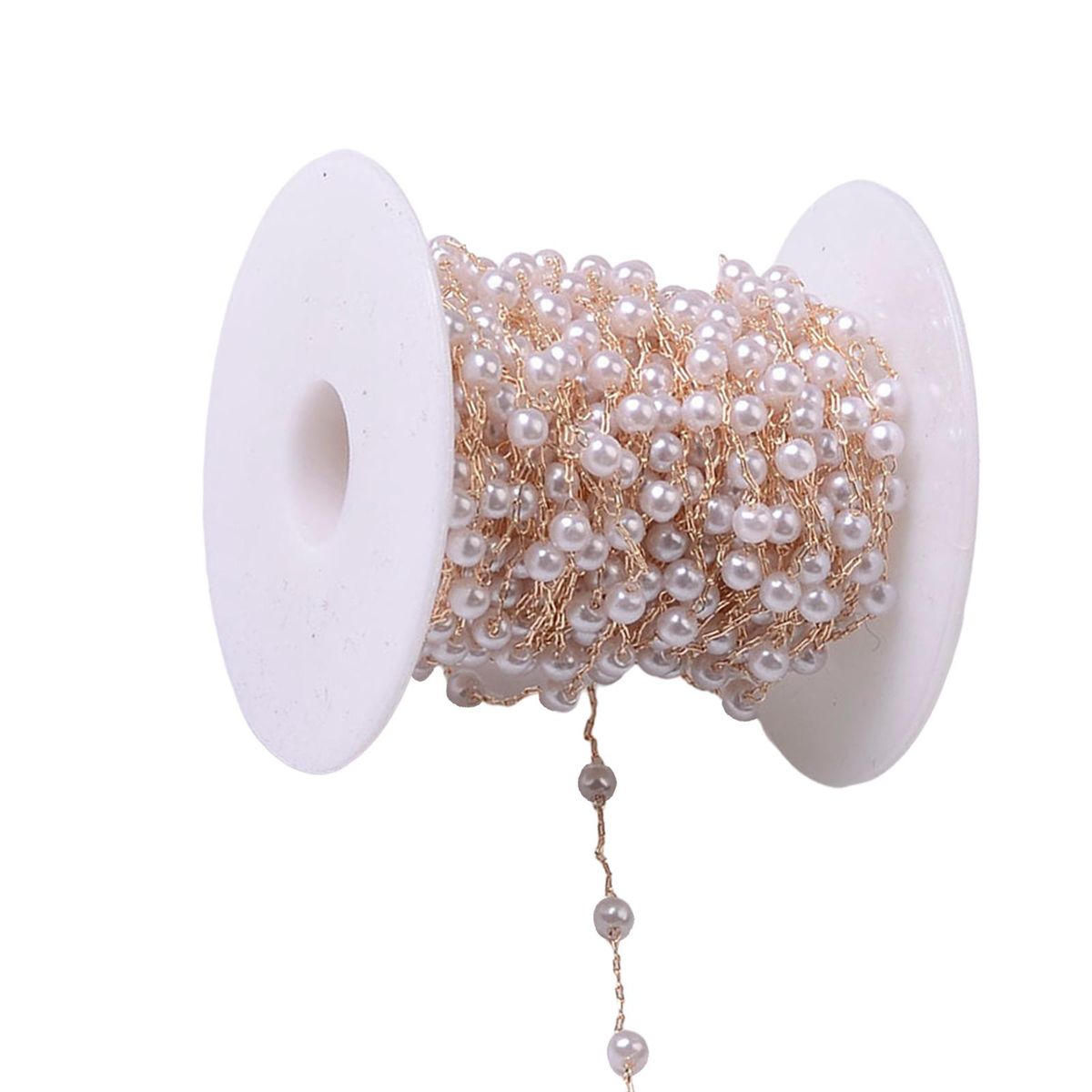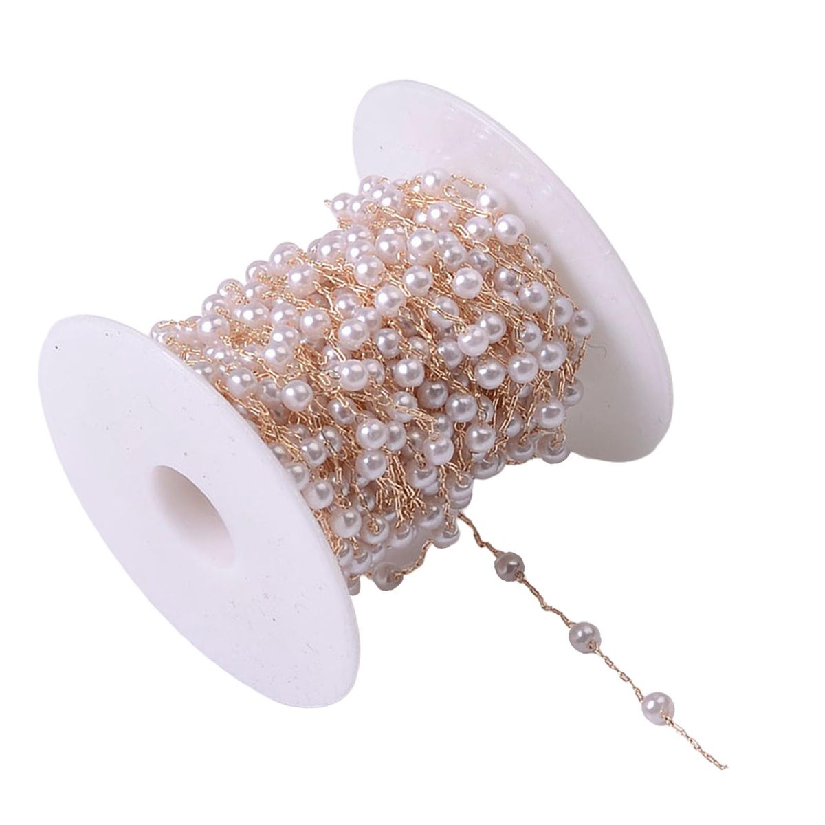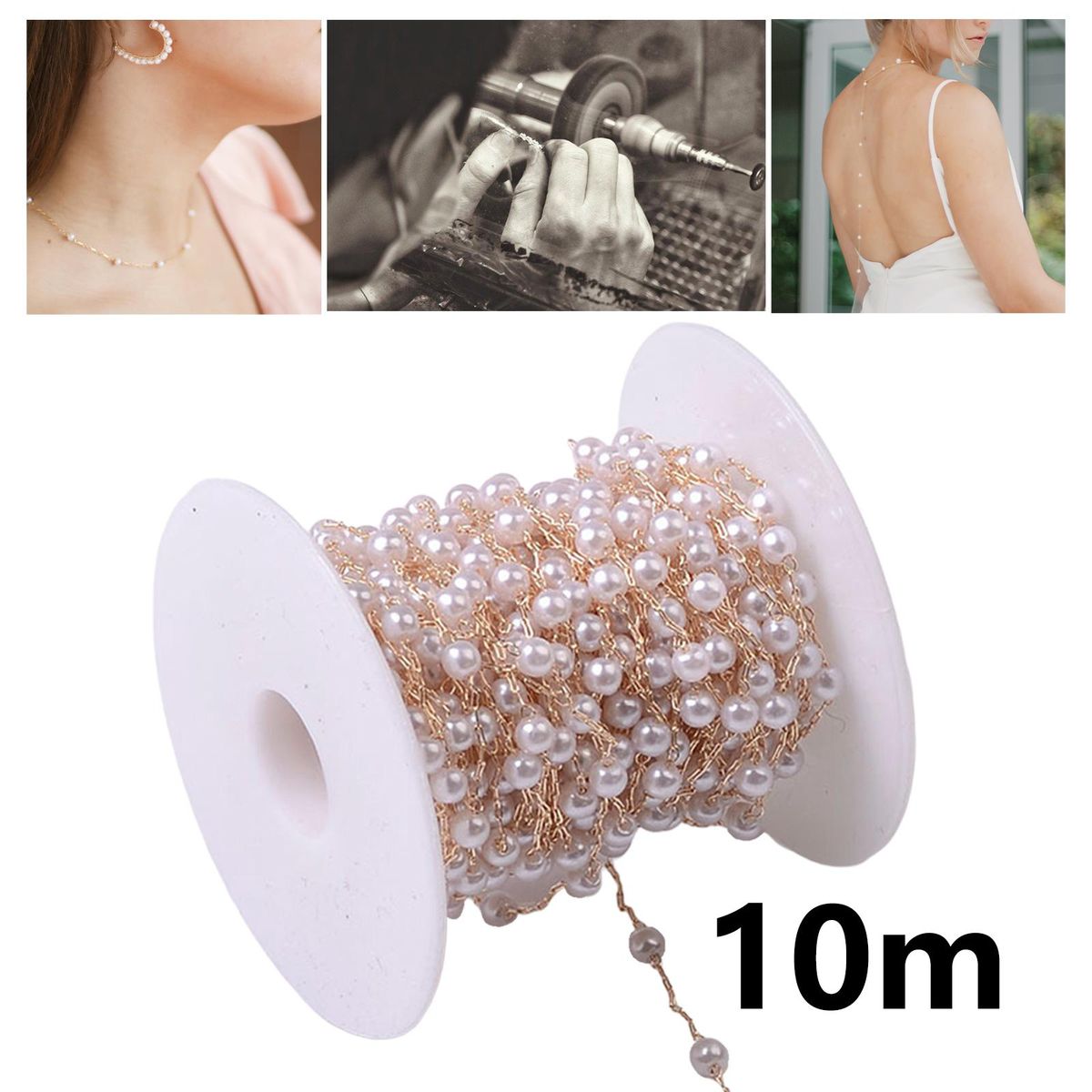 Material: Metal chain with pearl.Size: about pearl: 4mm wide; about 10 meters length, 32.8 feet in total.Easy to Use and Store: The chain is rolling in a reel to avoid knotting; when not in use, just roll it back to the reel, easy and convenient.Wide range of applications: You can use them to decorate lampshades, attach to tablecloths, make curtains, make your own chandeliers, necklaces, bracelets, earrings, glasses chain holders, etc.Tips: Please keep away from children under 3 years old; when you take a bath or do sports, please remove the chain necklace to prolong its life.