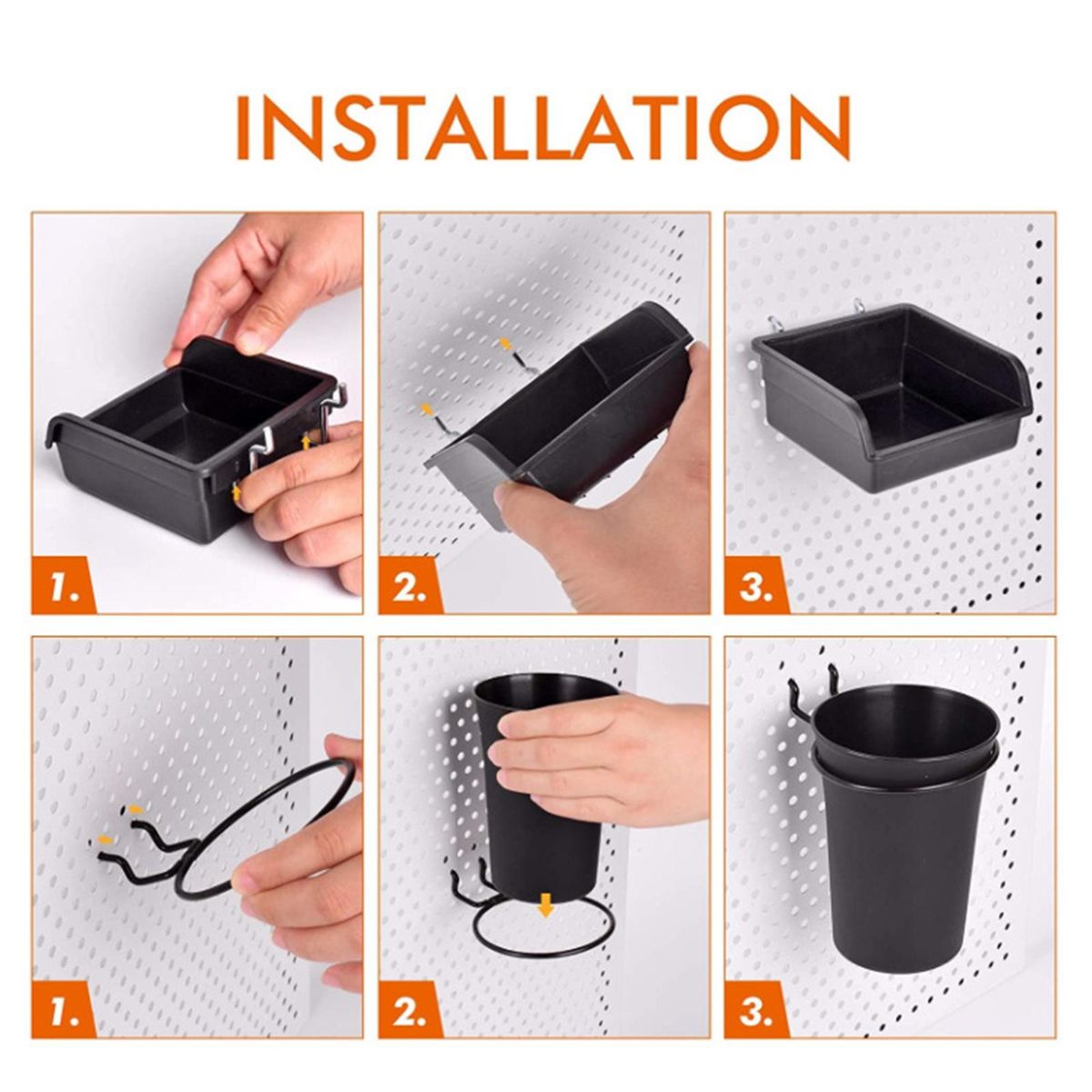[Convenient Metal Hooks] Universal Fit for 1/8 inch and 1/4 inch pegboards with 1 inch spacing. With angled hooks attachment, more stable locked into pegboard holes, bins and cups will always sit on the board well, never falling out when usage.