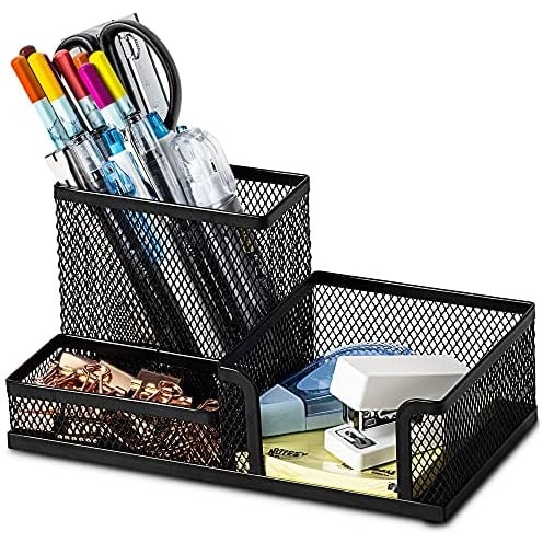 Office desktop caddy organizer, great for keeping your desktop neat and tidy.Made of durable scratch-resistant steel wire mesh with a reinforced metal rim.Features 3 compartments: Pen holder, memo holder, other stationeries compartmentA sleek versatile look with a black epoxy finish fits any office decor. The stationary in the picture is not included