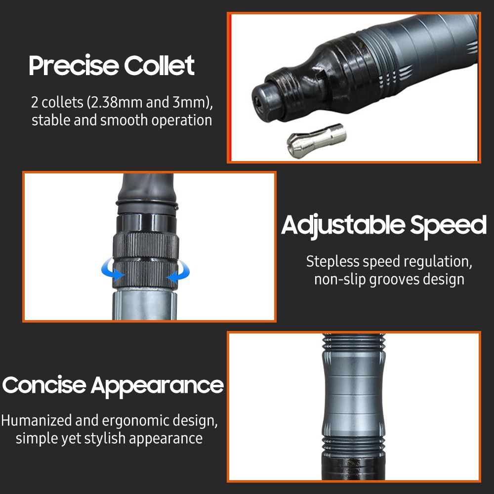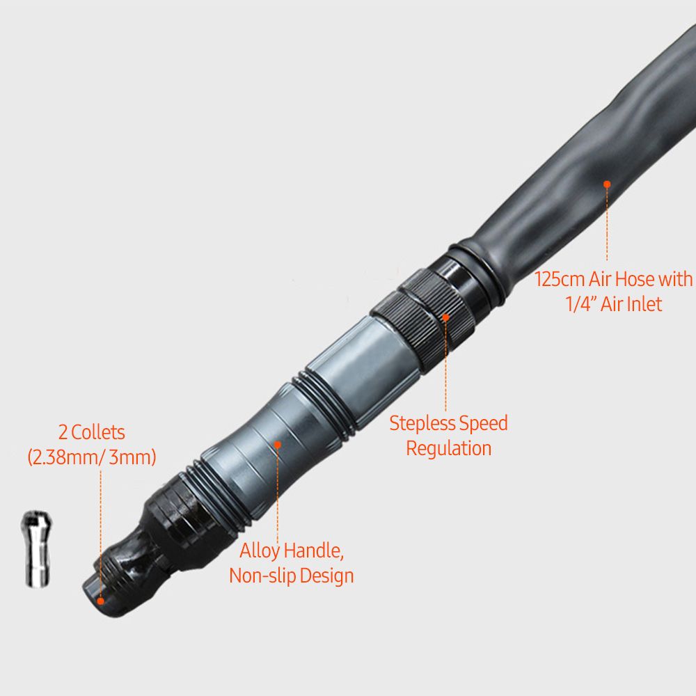 Pneumatic die grinder pen with 2 collets (2.38mm and 3mm) can be widely used in mould, car, metal, wood and more.