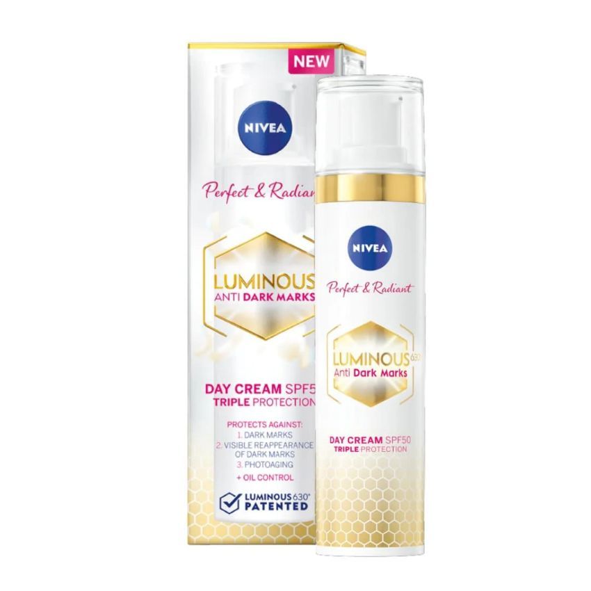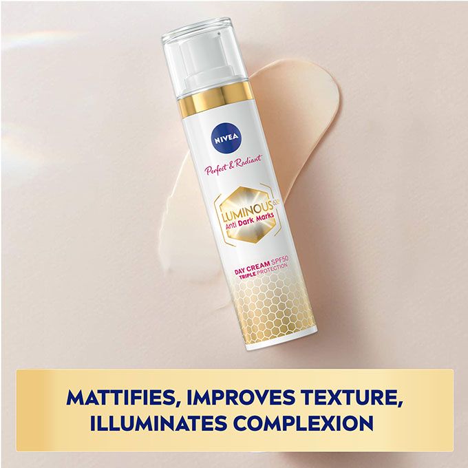 NIVEA Perfect & Radiant Luminous 630 Day Face Cream contains the highly effective patented LUMINOUS630® and is enriched with Hyaluron, Vitamin E and UVA/UVB filters. It acts on existing pigmentation to visibly reduce dark marks and spots, while the SPF50 helps to reduce the appearance of new dark marks. Skin is moisturised, mattified and smooth.