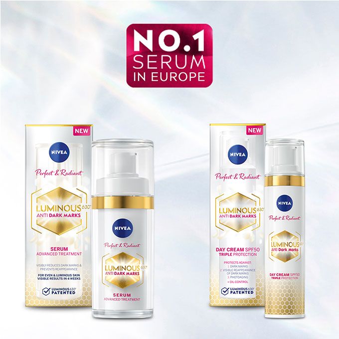 The advanced lightweight NIVEA Perfect & Radiant Luminous 630 Anti Dark Marks Serum contains the highest concentration of the breakthrough ingredient Luminous630 which visibly reduces 10 years of dark marks in 4 weeks*. The dual action formula acts on existing pigmentation to visibly reduce marks, while also working in conjunction with skin's natural melanin production to reduce the appearance of new dark marks. The soft texture absorbs quickly and is gentle enough for all skin types, including sensitive skin.