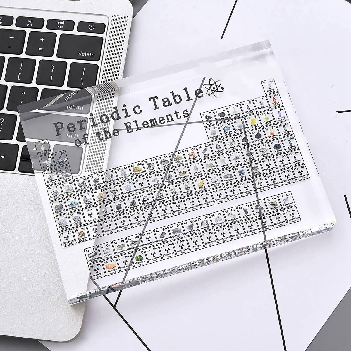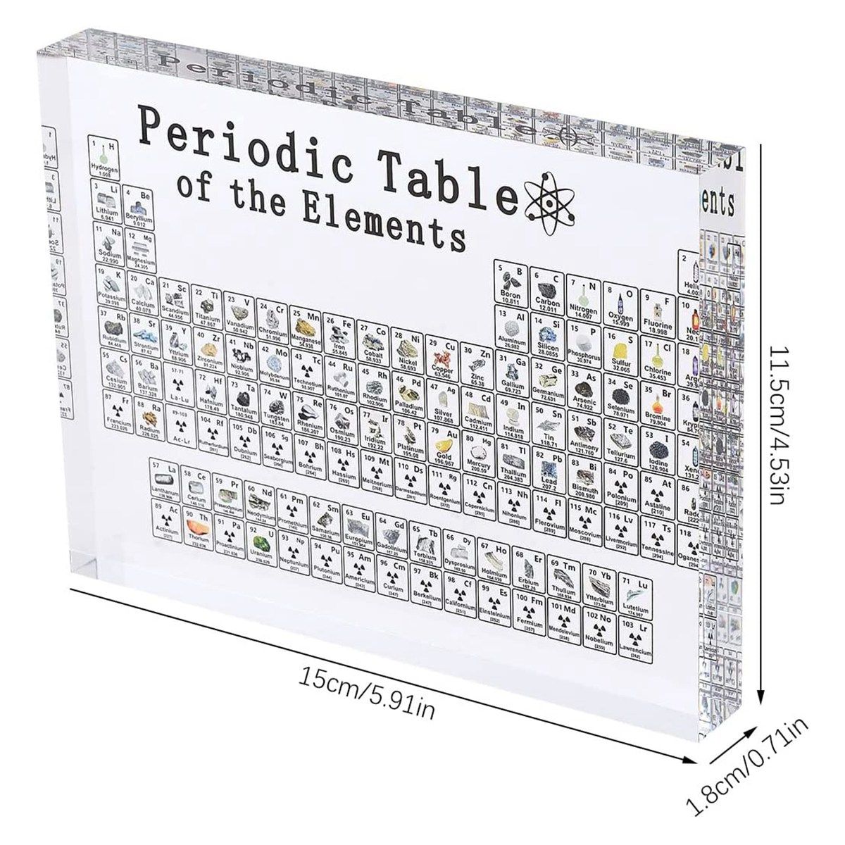 Detailed Information About The Product:Exquisite real periodic table display: product size: 6x4.5x0.7inch/15x11.5x1.8cm. Unlike other printed versions, our periodic table contains 85 real stable elements. Because of the radioactivity and rarity of some products, they are excluded.. The periodic table of elements is made of acrylic acid, with high light transmittance, and the elements inside can be cleay seen.