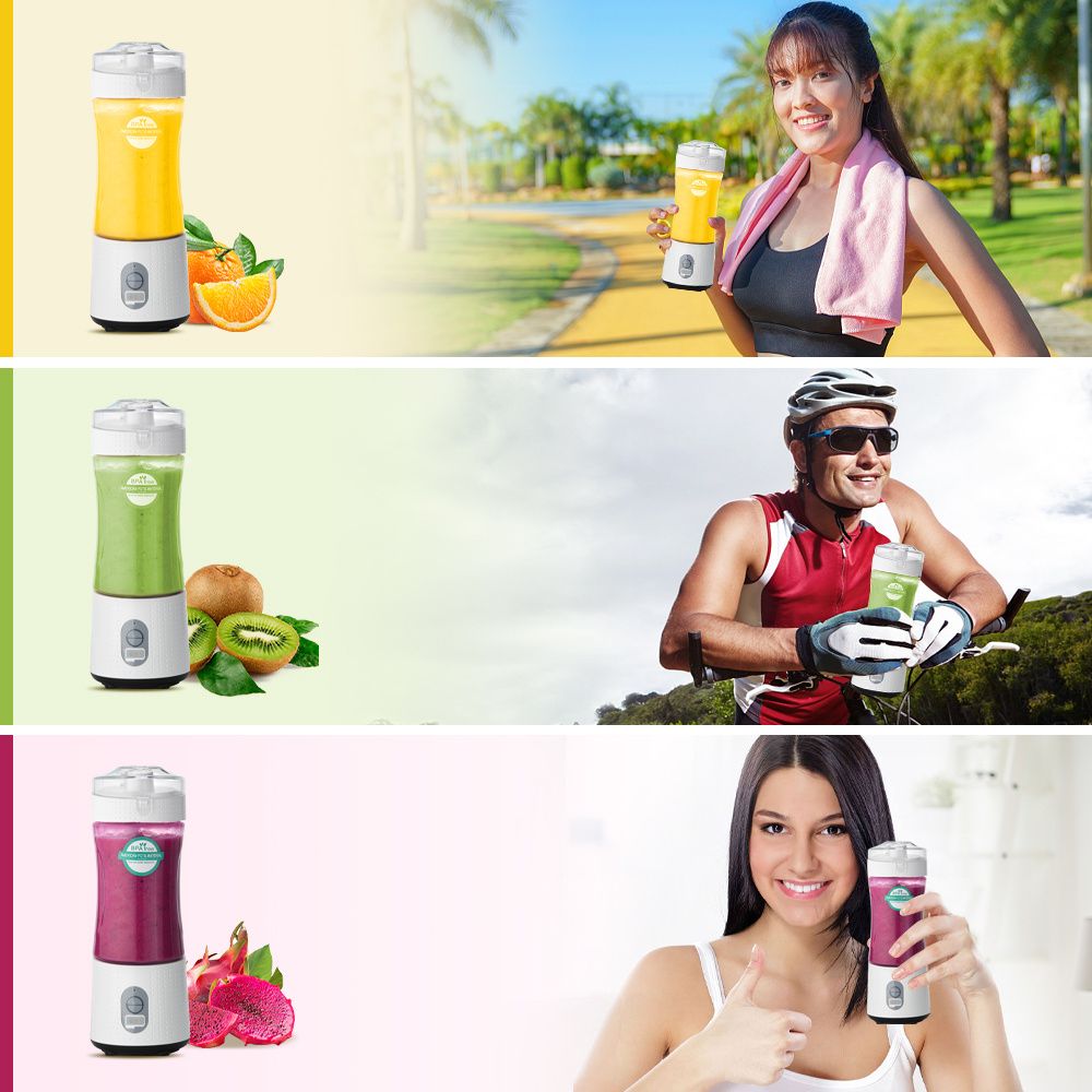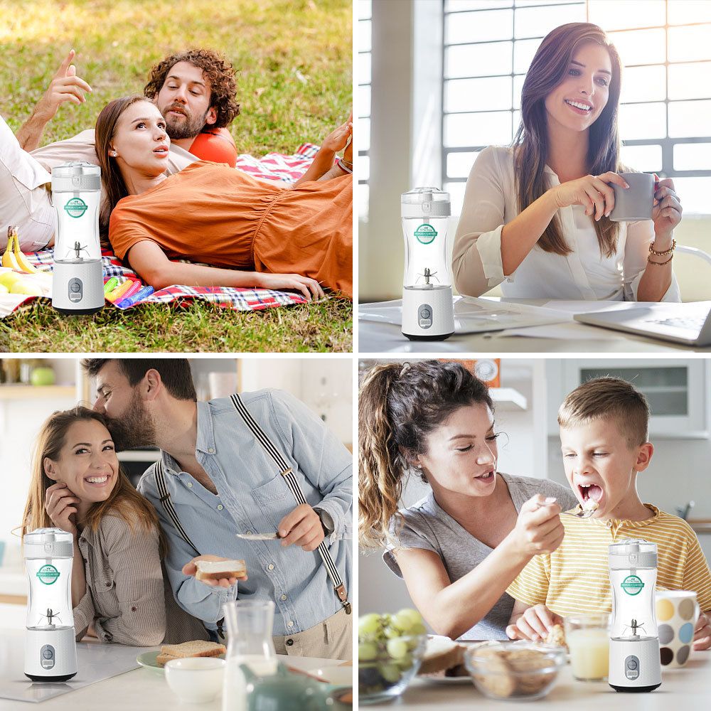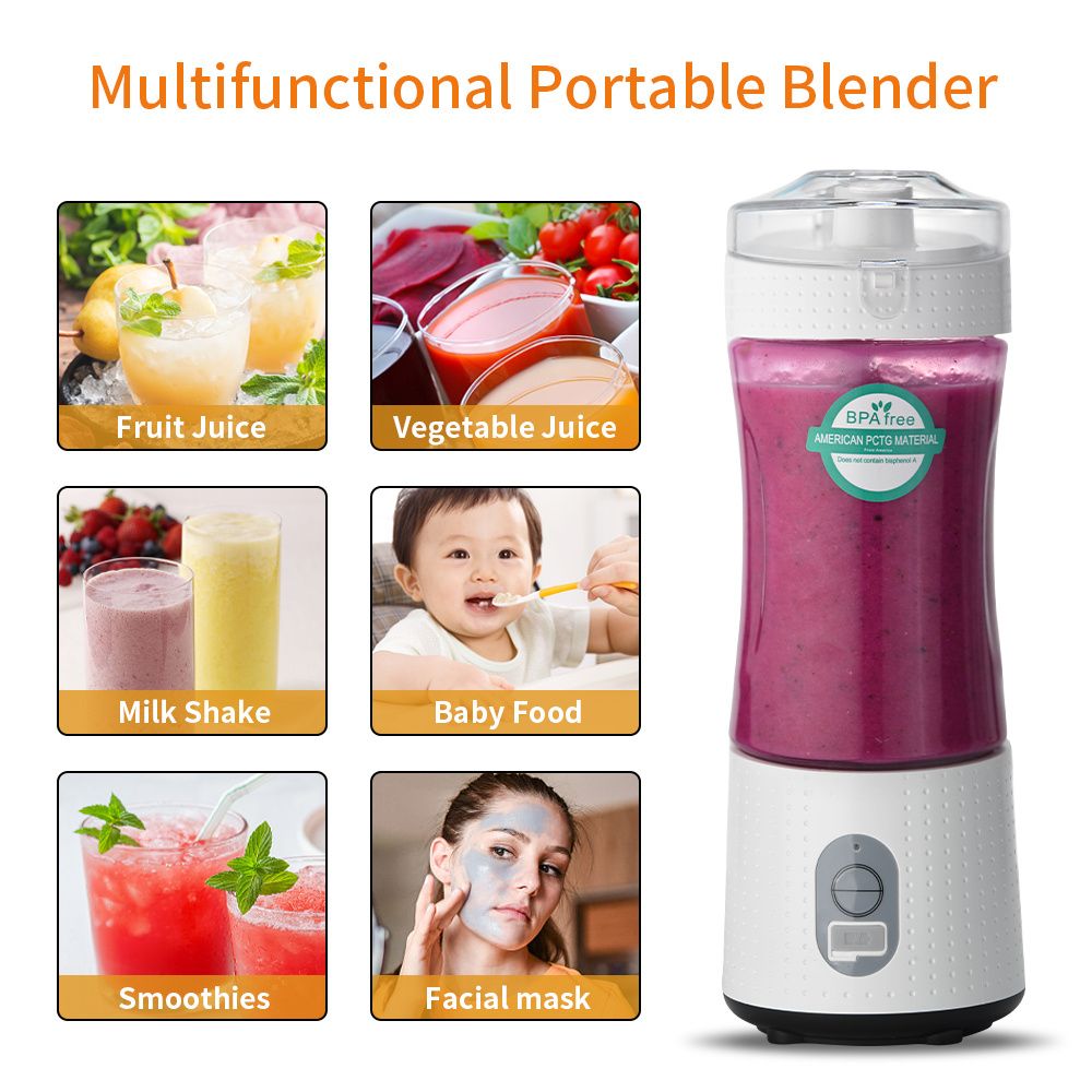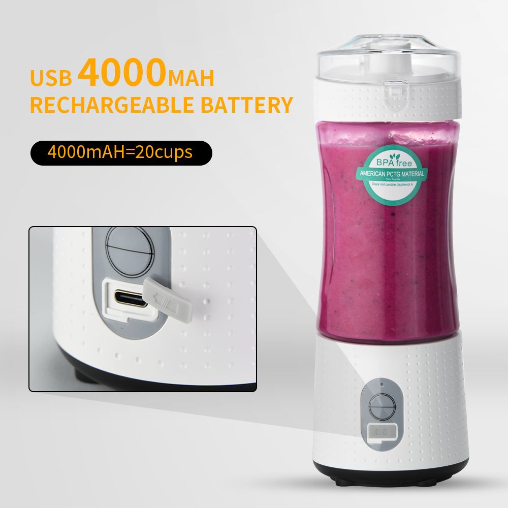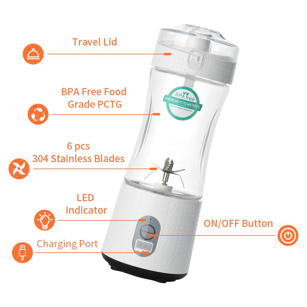 Advanced Portable Blender USB Rechargeable: This portable blender is BPA free, made by food-grade and non-toxic PCTG Baby bottles materials. It has unique safety design including magnetic induction, automatic stop, silicone charging port protection, non-slip and shock absorption base. The eco-friendly material and the unique safety design give you a duplicate protection and make you feel safe while enjoying delicious fresh juice, shakes and smoothies.