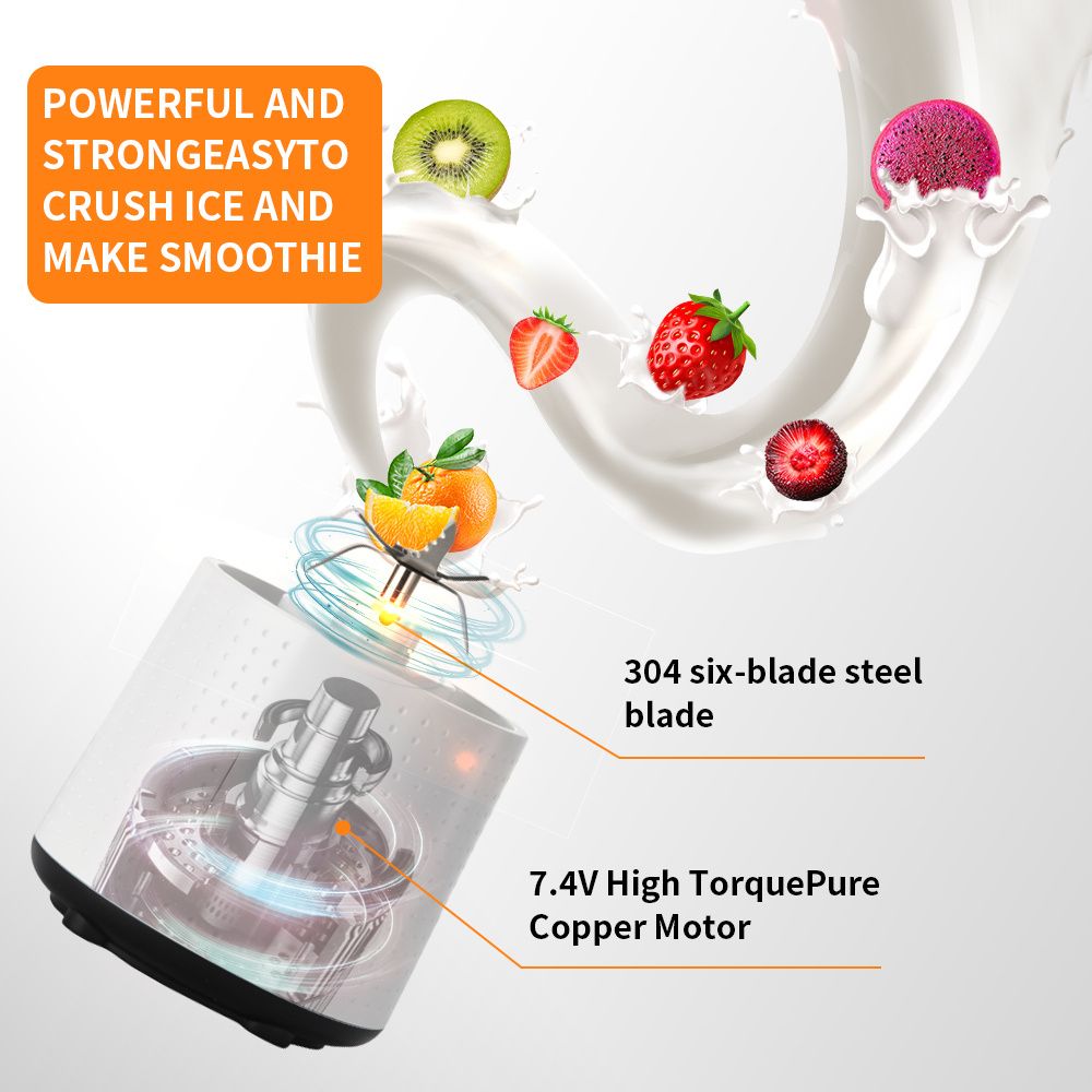 Strong Power: The small cordless personal smoothie blender use pure copper wire 7.4V powerful motor, high speed (22000 rpm), can rapidly rolling shatter. 30 seconds efficient ice cream juice. This electric USB Travel Sport Mini blender cup built-in Big Six Blades in 3D. The big 6 Blades single serve personal blender has stronger power than traditional 4 Mini Blades Personal Blender.