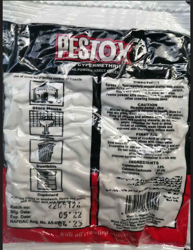 PESTOX 2% CYPERMETHRIN (The powder insect killer). The powder kills cockroaches, bedbugs, ants and other crawling insects dead. Description : Spread product regularly around drains, into dustbins, under furniture/cupboards, into cracks in wood work, floors and walls and other dark areas.Dispose content and container in a safe way. Avoid contact with food.