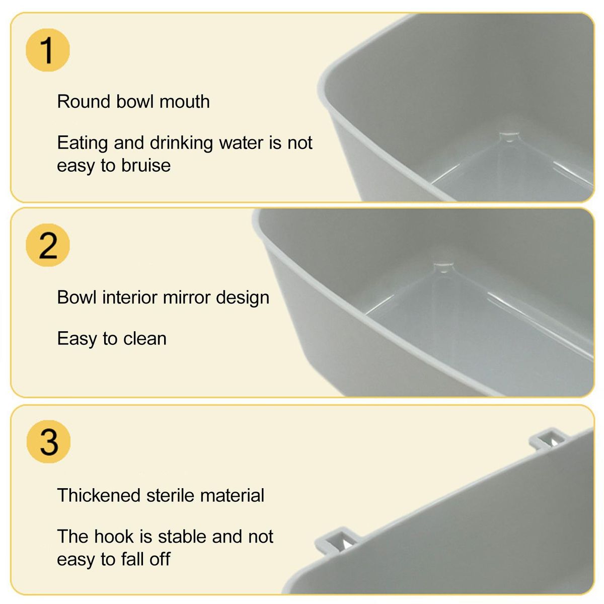 For added convenience, we have included a hook on the back of the bowl, allowing for easy installation on any metal cage. the thickened wall of the hook provides excellent stability, ensuring it stays securely in place even with force applied. .