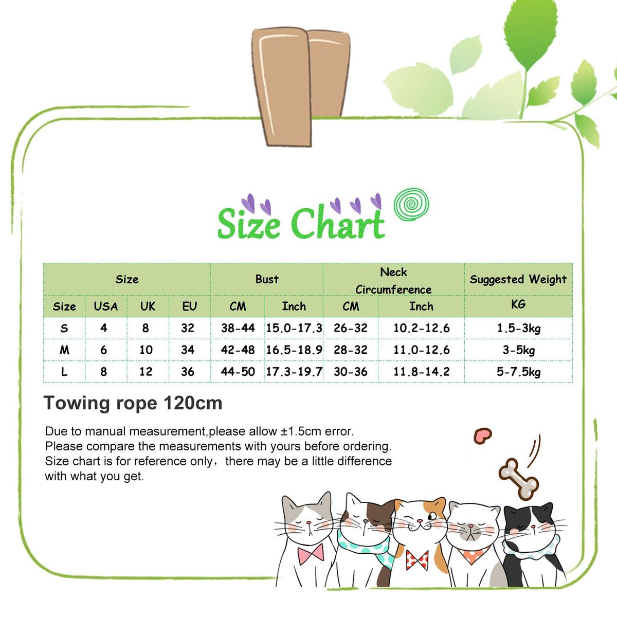 Size: L, Bust: 44cm-50cm/17.3"-19.7", Neck Circumference: 30cm-36cm/11.8"-14.2", Suggested Weight: 5kg-7.5kg (Approx.)